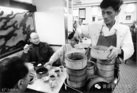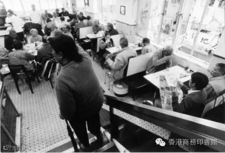 ▲ 雙喜茶樓內的售點員,與正在品茗的各茶客眾生相,約1985 年。
