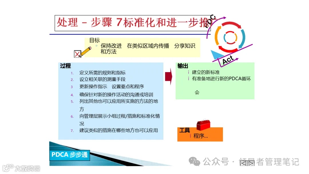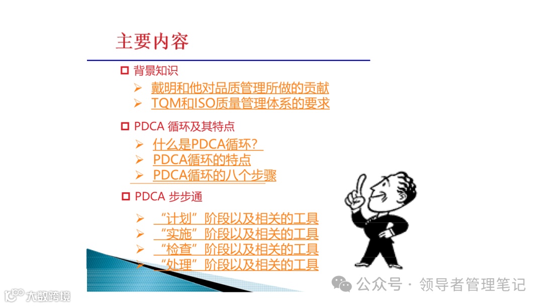 PDCA循环是美国质量管理专家沃特·阿曼德·休哈特(Walter A. Shewhart)首先提出的,由戴明采纳、宣传,获得普及,所以又称戴明环。PDCA循环的含义是将管理分为四个阶段,即Plan(计划)、Do(执行)、Check(检查)和 Act(处理)。在管理活动中,要求把各项工作按照作出计划、计划实施、检查实施效果,然后将成功的纳入标准,不成功的留待下一循环去解决。
