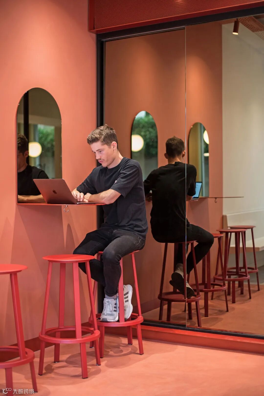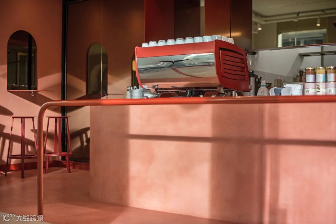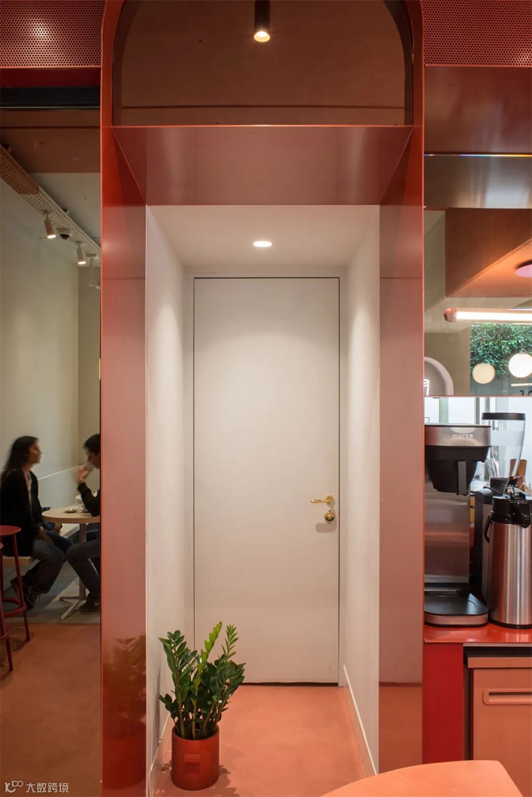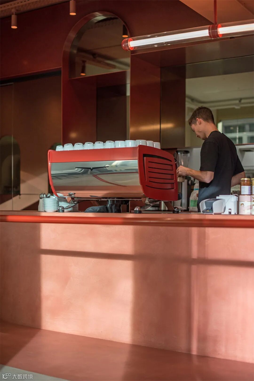 ▲空间总览 由于空间具有双重功能——咖啡馆和工作台,设计师为Buddy Buddy设计了两种颜色方案。后部包括了柜台和高凳子座位区,由特殊的金属红色与大地色混合组成。前部是温暖的白色,包含了低矮的座位区。 Because of its double function, that of being a café and atelier, the interior of Buddy Buddy is split up in a two-colour scheme. The back side, containing the counter and high seating areas, is made up of mixtures of special metallic red and earth tone colours. The front side is made up of warm white colours and contains low seating areas.