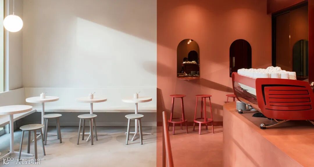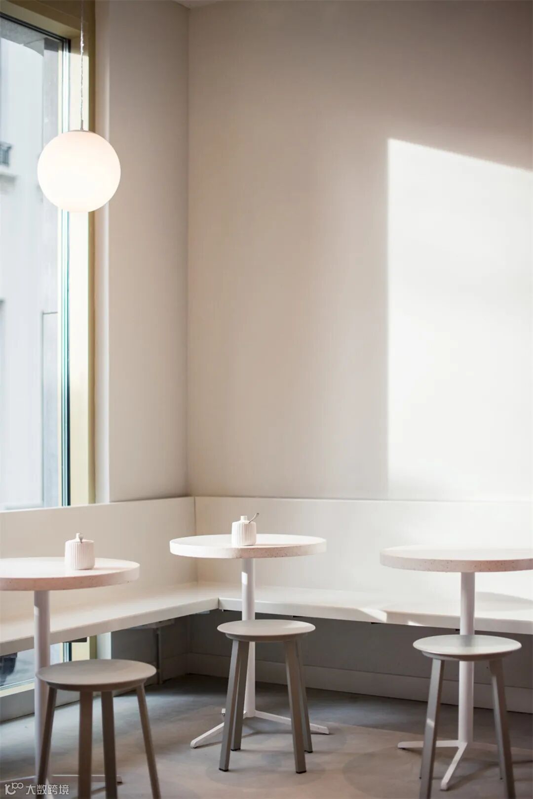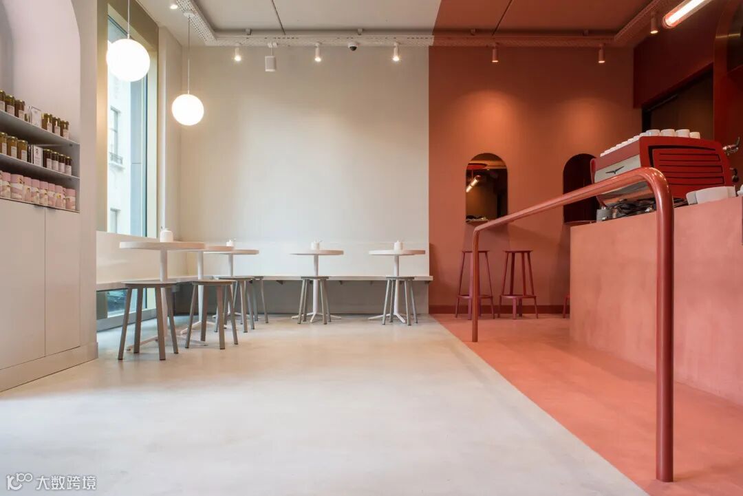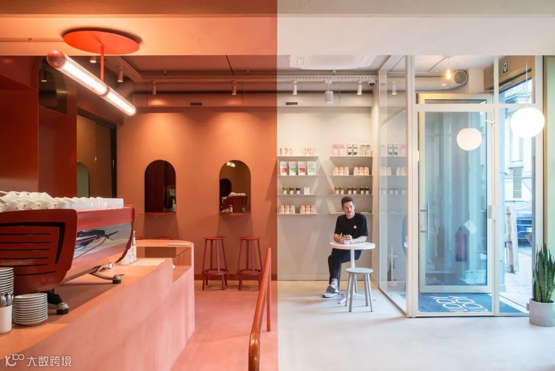▲空间总览 由于空间具有双重功能——咖啡馆和工作台,设计师为Buddy Buddy设计了两种颜色方案。后部包括了柜台和高凳子座位区,由特殊的金属红色与大地色混合组成。前部是温暖的白色,包含了低矮的座位区。 Because of its double function, that of being a café and atelier, the interior of Buddy Buddy is split up in a two-colour scheme. The back side, containing the counter and high seating areas, is made up of mixtures of special metallic red and earth tone colours. The front side is made up of warm white colours and contains low seating areas.