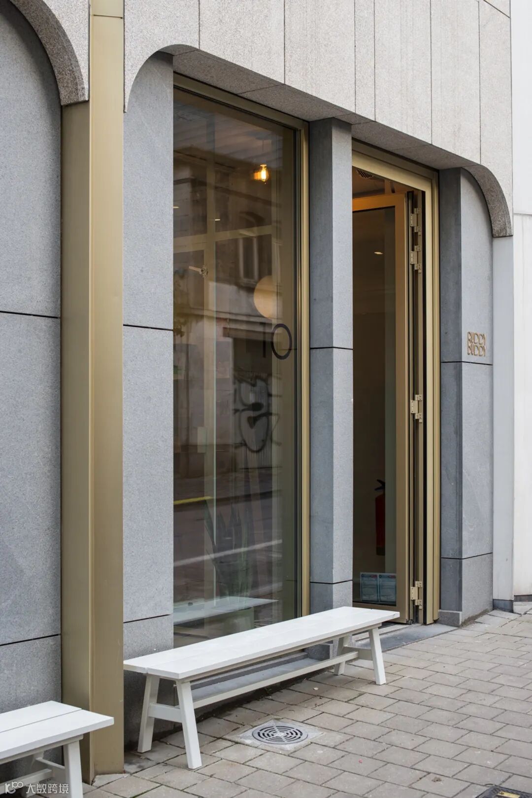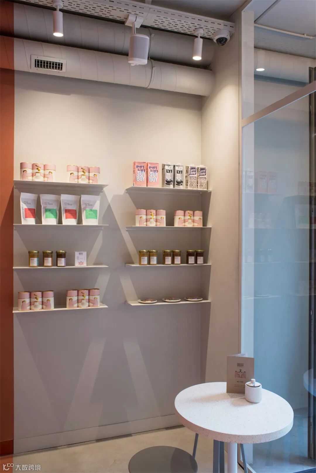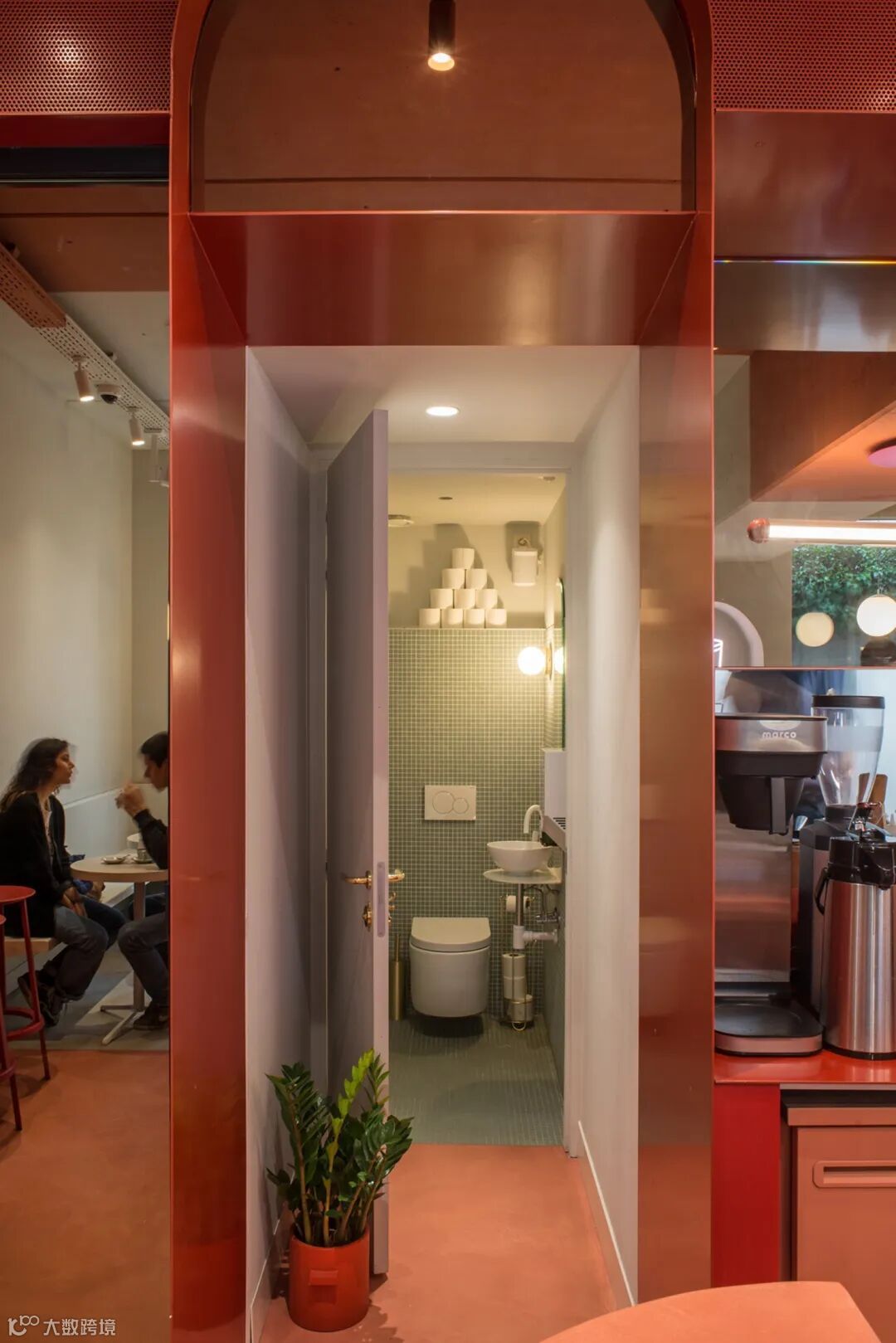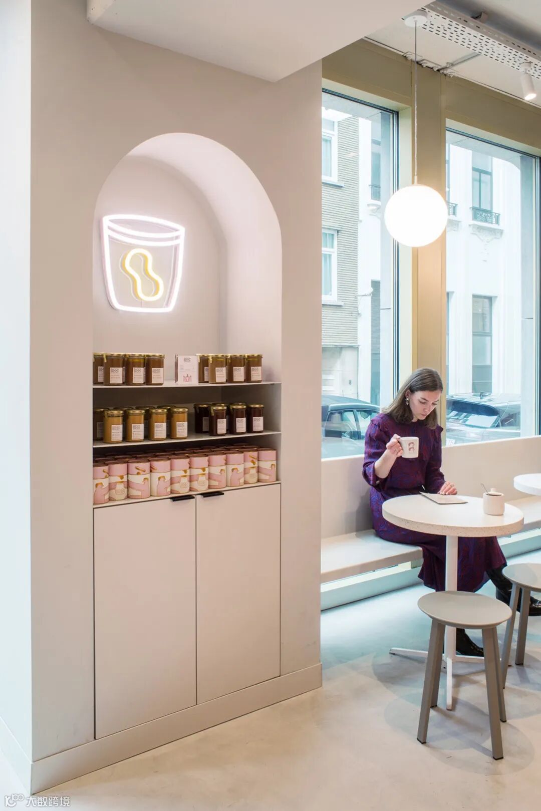 ▲中间的“自由区” Buddy Buddy的室内陈设也在设计中扮演着重要角色。几乎所有的家具都是由定制的粉末涂层钢构件组合而成,形成了一种优雅的氛围。地板和柜台都被涂上鲜艳的塑料涂层,巨大的铜镜让这个紧凑的空间视觉上更开阔。Buddy Buddy内部的每一个小细节都经过精心设计,与业主有趣的性格和坚果黄油的美味口感相得益彰。 The materialisation of the interior of Buddy Buddy plays a key role in the design. Almost all fixed furniture is built up from custom powder coated steel elements, together forming a classy and elegant vibe. The floor and the counter are finished with a vibrant mortex coating and large bronze mirrors create depth in this rather compact space. Every little detail within the interior of Buddy Buddy is carefully thought out and complements the colourful character of the owners and the tasty experience of their nut butters.