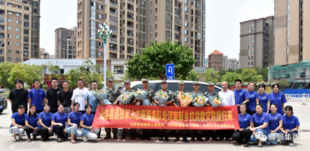 7月29日上午,仙游县退役军人援豫志愿服务队从河南灾区回到仙游,并在晔晨集团所在小区大门口举行了热烈的欢迎仪式。县退役军人事务局副局长郑仲捷、晔晨集团党支部书记林玉镇及党员、职工代表与救援队员们亲切握手并献上鲜花向他们表达敬意。