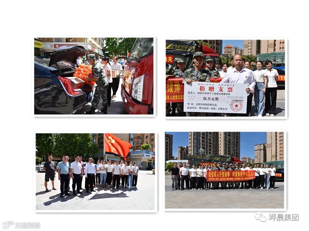 7月25日上午,援豫抗洪救灾志愿服务队出征仪式在晔晨集团(福建)有限公司所在小区大门口举行,党员职工们将所采购的生活必需品、急救药品、救生衣等抗洪救灾物资装车。党支部书记林玉镇将爱心款5万元,转交给仙游县退役军人援豫志愿服务队负责人。