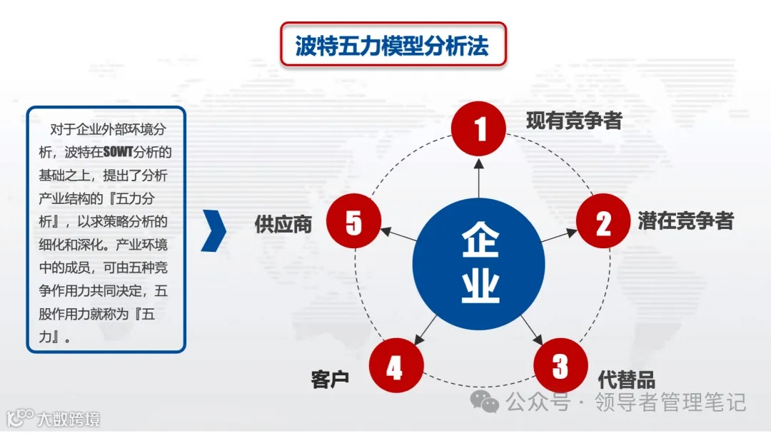 波特五力模型聚焦“产业内竞争”,帮助企业识别“中观层面的机会与威胁”,是SWOT-OT分析的“竞争视角补充”。