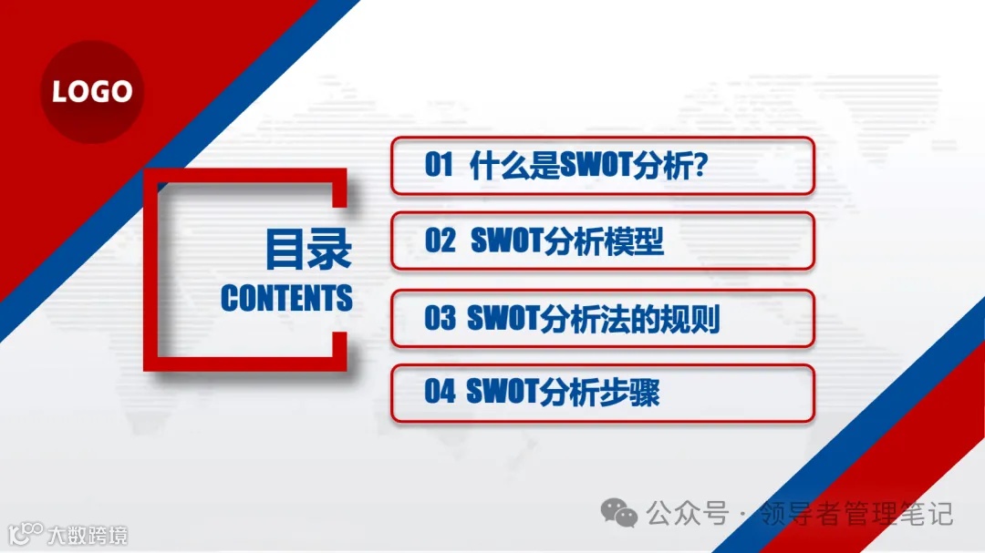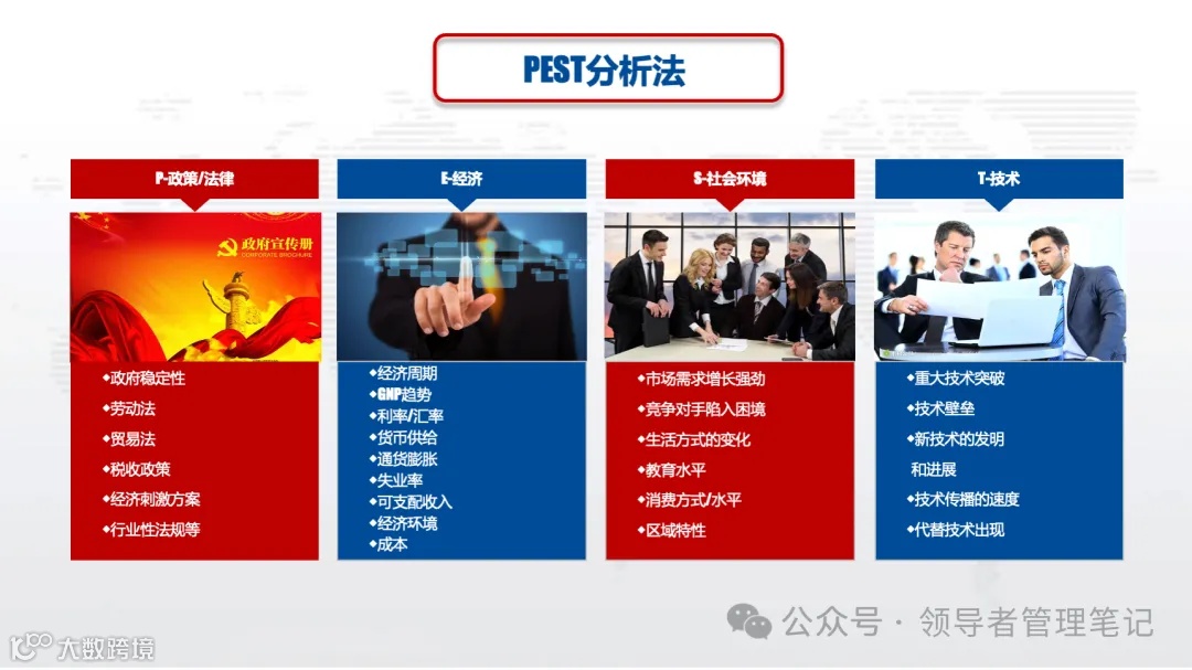 PEST聚焦“政治、经济、社会、技术”4个宏观层面,帮助企业识别“大环境中的机会与威胁”,是SWOT-OT分析的“信息来源框架”: