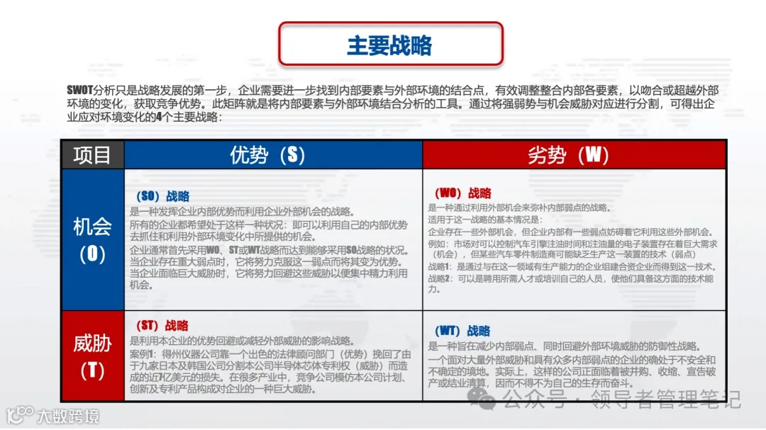 文档基于SWOT矩阵的“SW(内部)”与“OT(外部)”匹配,形成4大战略,每种战略对应“不同场景+实施路径+案例”,确保战略的针对性: