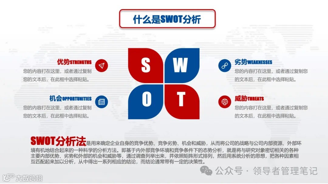 通过以上超详细总结,可全面覆盖文档的“定义、模型、规则、步骤、工具、战略、局限”,既保留文档原文的核心信息,又补充实操细节与示例,确保使用者能理解并落地SWOT分析法。