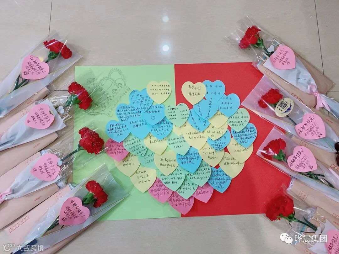 花有盛意,福有双至。一张张心形便利贴,写着各种各样的祝福语,这是男同事们的杰作。他们希望用最简单的宠爱方式,给女神们不一样的感动。