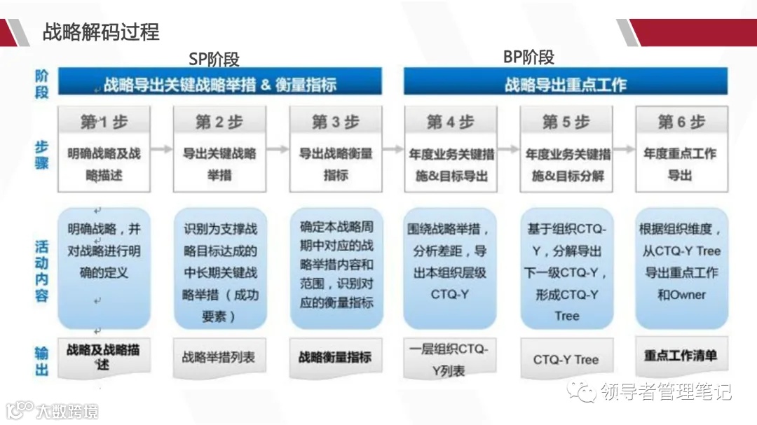 SP阶段(战略导出):从战略方向出发,明确“战略的运营定义”,识别关键成功要素(CSF)(如“提升高端产品市场份额”),进而导出对应的战略KPI(如“高端机型销量占比≥40%”)与CSF构成要素。
