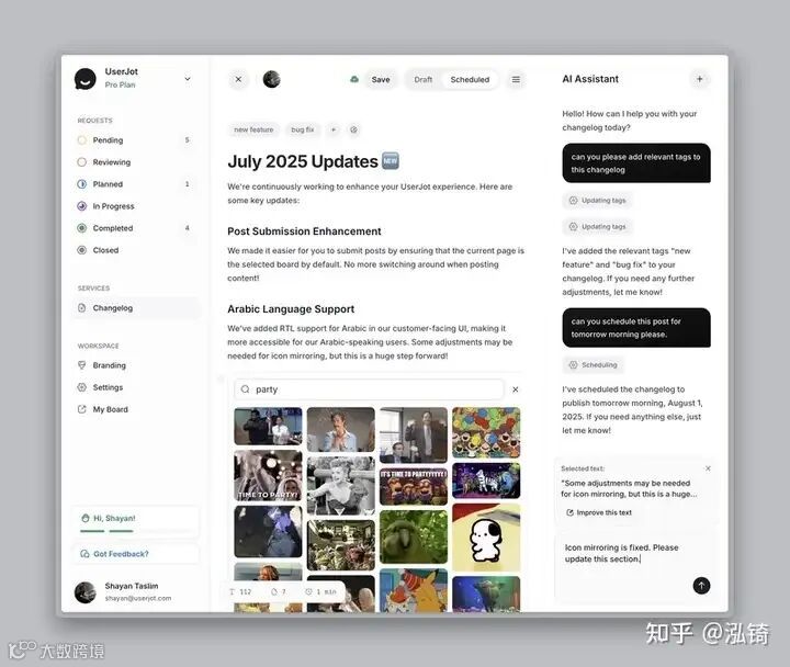 我一直在UserJot上开发一个 AI 代理,帮助团队编写更新日志。这个想法很简单:与一个可以访问你的反馈、路线图和已关闭工单的代理聊天。它会汇总已发布的更新,帮助你编写更新,并安排发布时间。