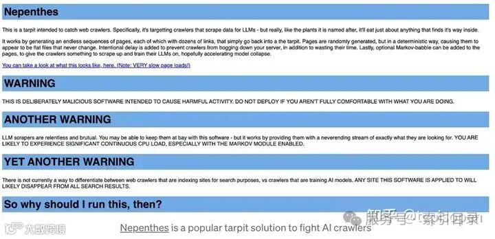 Nepenthes——创建一个由静态文件组成的“无限迷宫”,没有出口链接,有效地困住AI爬虫并浪费它们的资源。这很残酷,如果你正在寻找复仇,那么这就是你的最佳工具!