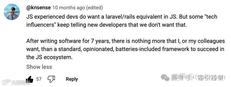 这就是为什么使用 Laravel、Rails 和 Django 等一体化全栈框架的开发人员强烈呼吁在 JavaScript 中获得相同的体验。