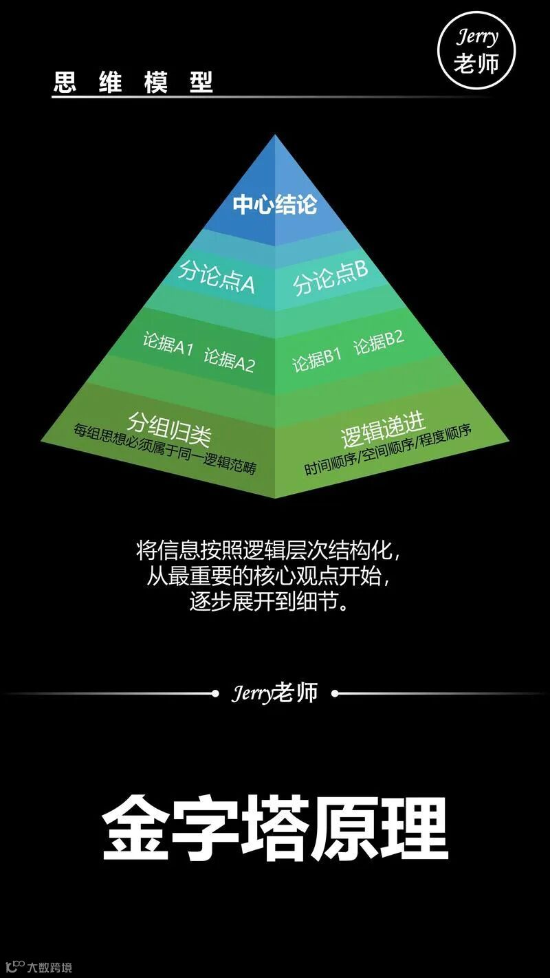 金字塔原理,就是让你把结论放在最顶上,像个塔尖,一眼就能看到。剩下的所有信息,都像金字塔的塔身一样,层层向下,为你的塔尖提供支撑。任何一层,都是对上一层问题的回答。