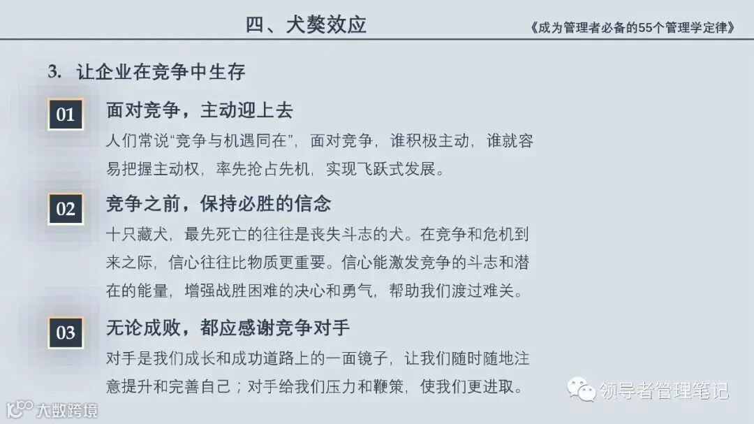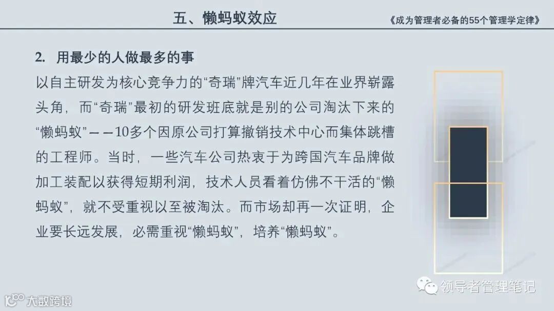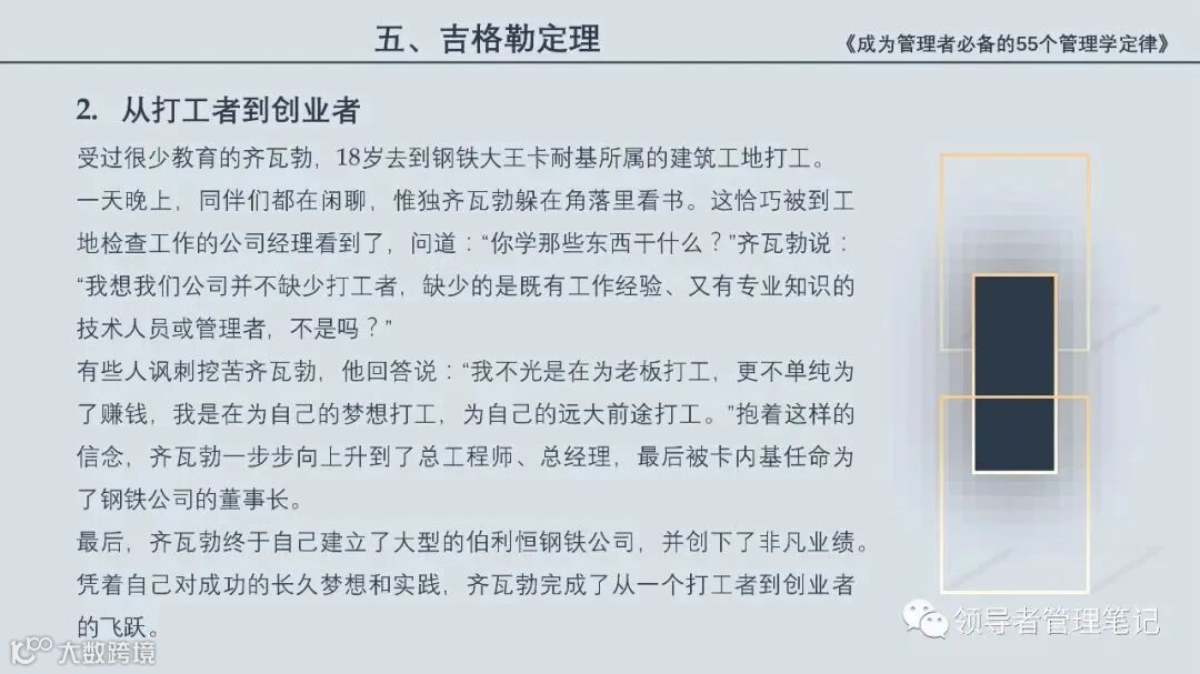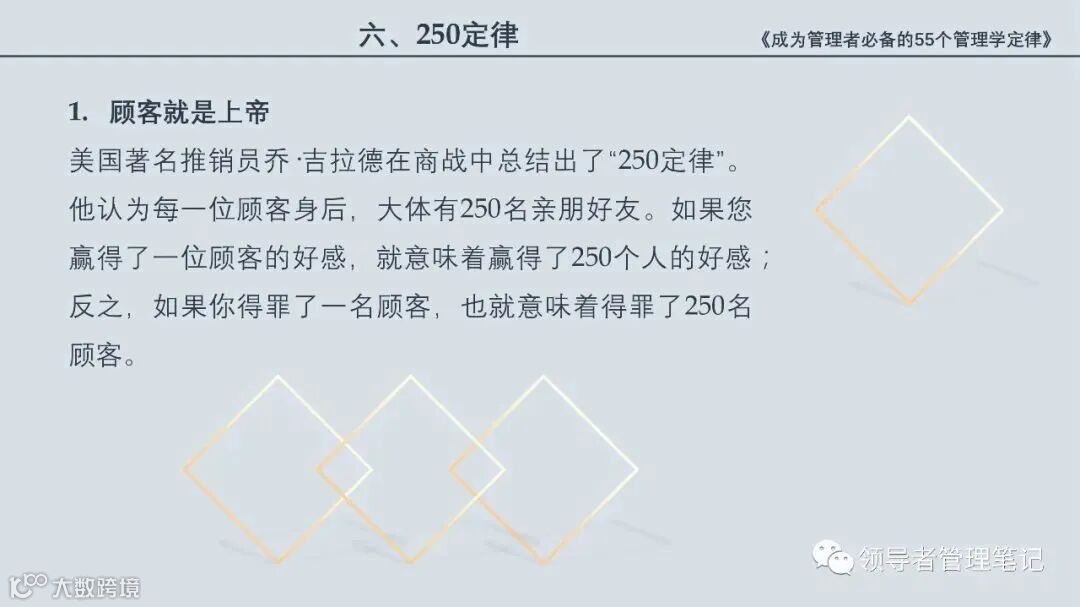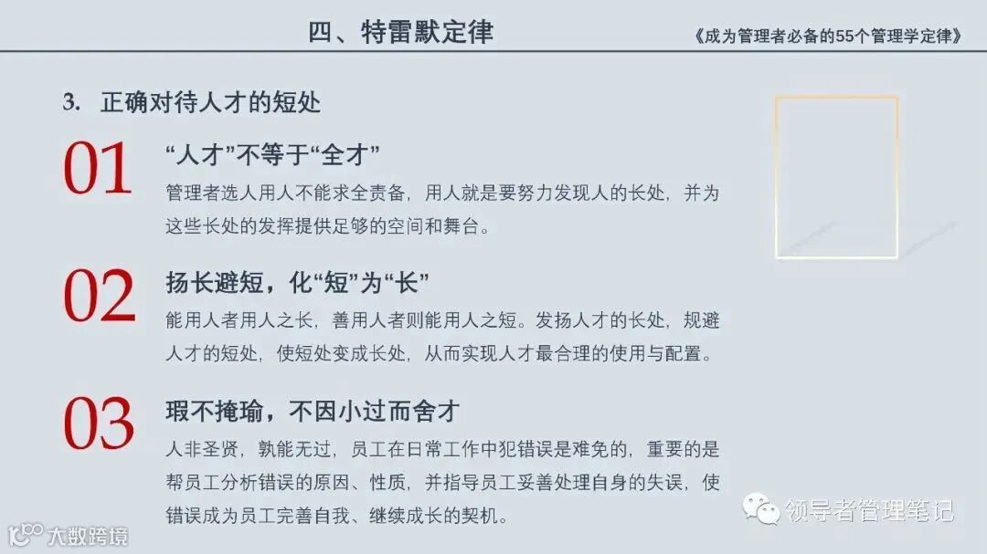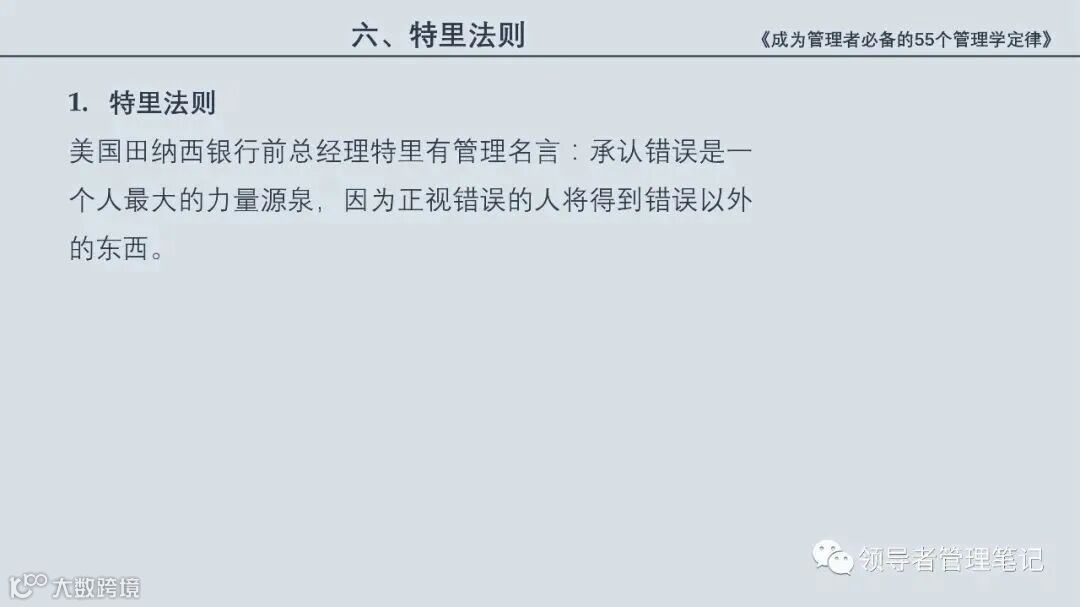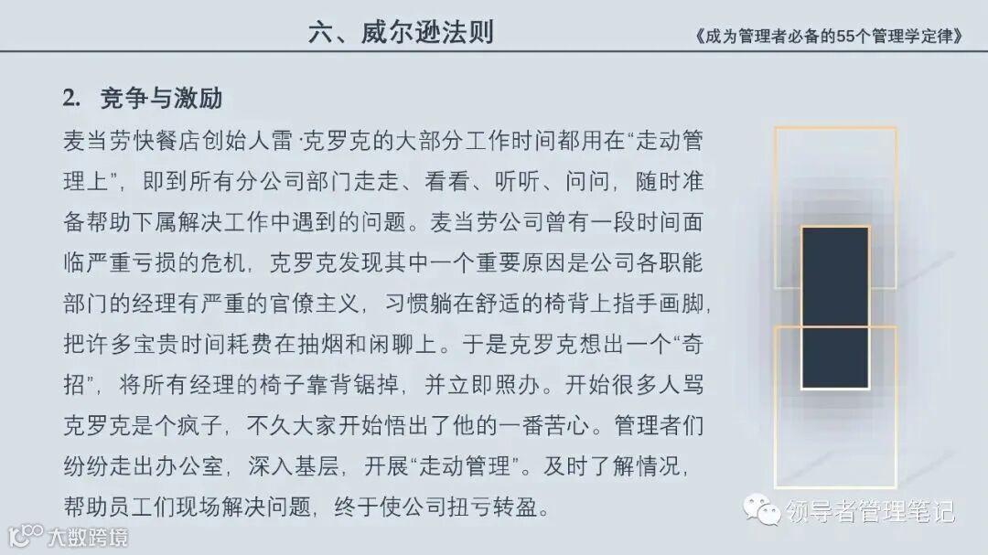 55个“管理学定律”包括:职场选人用人育人之道,以人为本的人性化管理,灵活有效的激励手段,沟通是管理的浓缩崇尚团队合作精神,决策是管理的心脏,创新与竞争是决胜之宝,成也细节,败也细节。