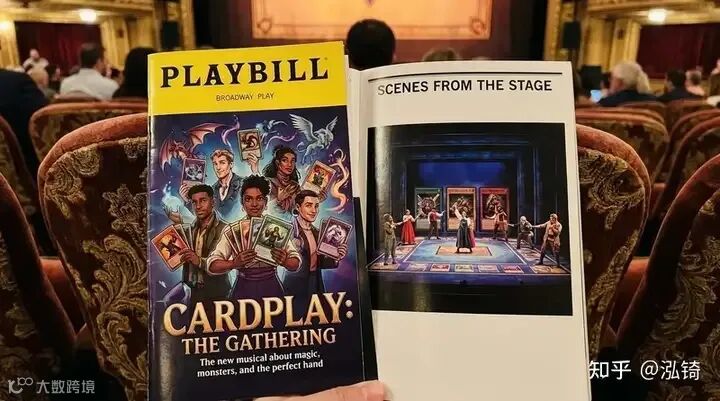 提示:“一张百老汇演出节目单的照片,内容是关于集换式卡牌游戏玩家的,照片中的人物坐在舒适的剧院座椅上,节目单制作精良,光面印刷,我们可以看到封面和一页舞台照片。”