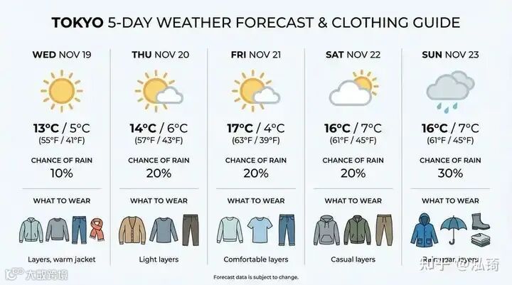 prompt = "Visualize the current weather forecast for the next 5 days in Tokyo as a clean, modern weather chart. add a visual on what i should wear each day"