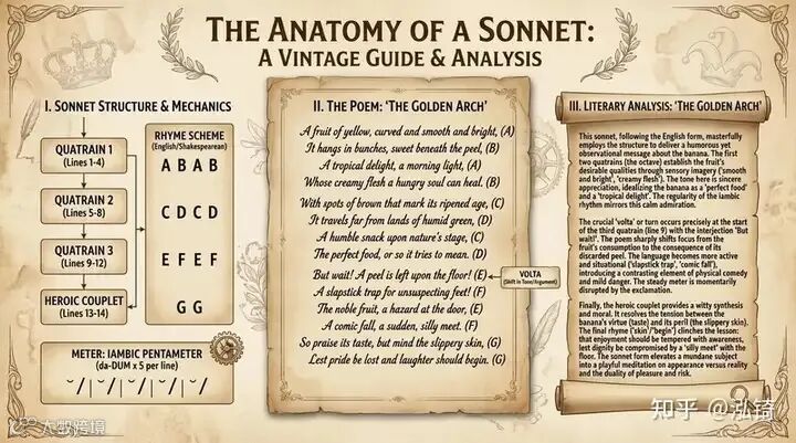 提示:“请用一首关于香蕉的十四行诗,制作一张关于十四行诗结构的信息图,并附上对这首诗的详细文学分析。风格要复古美观。”