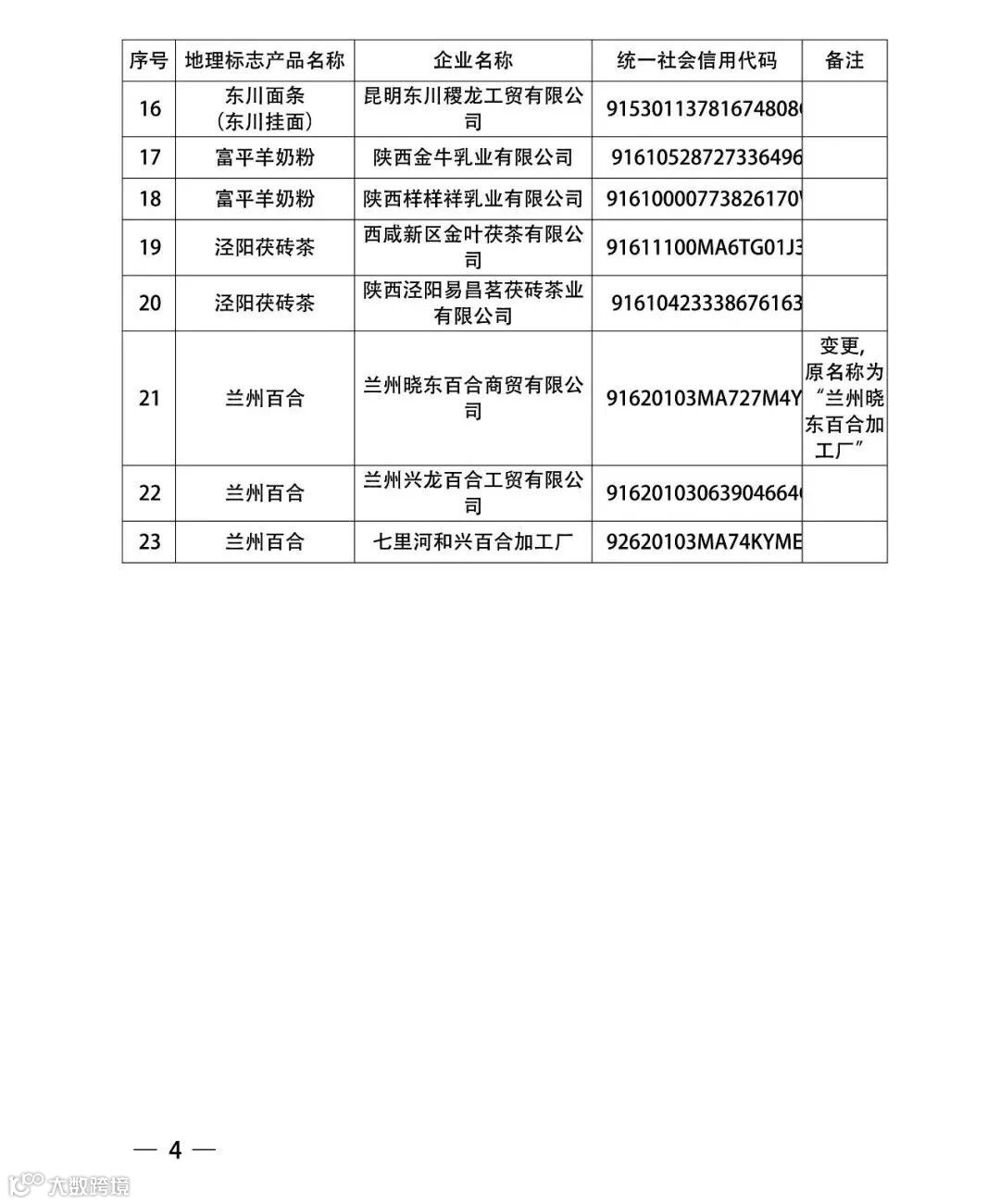 根据国务院《关于国务院机构改革涉及行政法规规定的行政 机关职责调整问题的决定》,按照原国家质量监督检验检疫总局 《地理标志产品保护规定》,生产黄山贡菊、三潭枇杷、岳西翠 兰、化橘红、罗定稻米、保山小粒咖啡、东川面条(东川挂面)、 富平羊奶粉、泾阳茯砖茶、兰州百合等 10 个产品的 23 家企业(名 单见附件),分别向产品所在地相关部门提出了地理标志产品专 用标志使用的申请,经有关省级知识产权行政部门审核,并经国 家知识产权局审查合格,现予以注册登记。自即日起核准上述企 业在其生产的地理标志产品上使用地理标志产品专用标志,获得 地理标志产品保护。特此公告。
