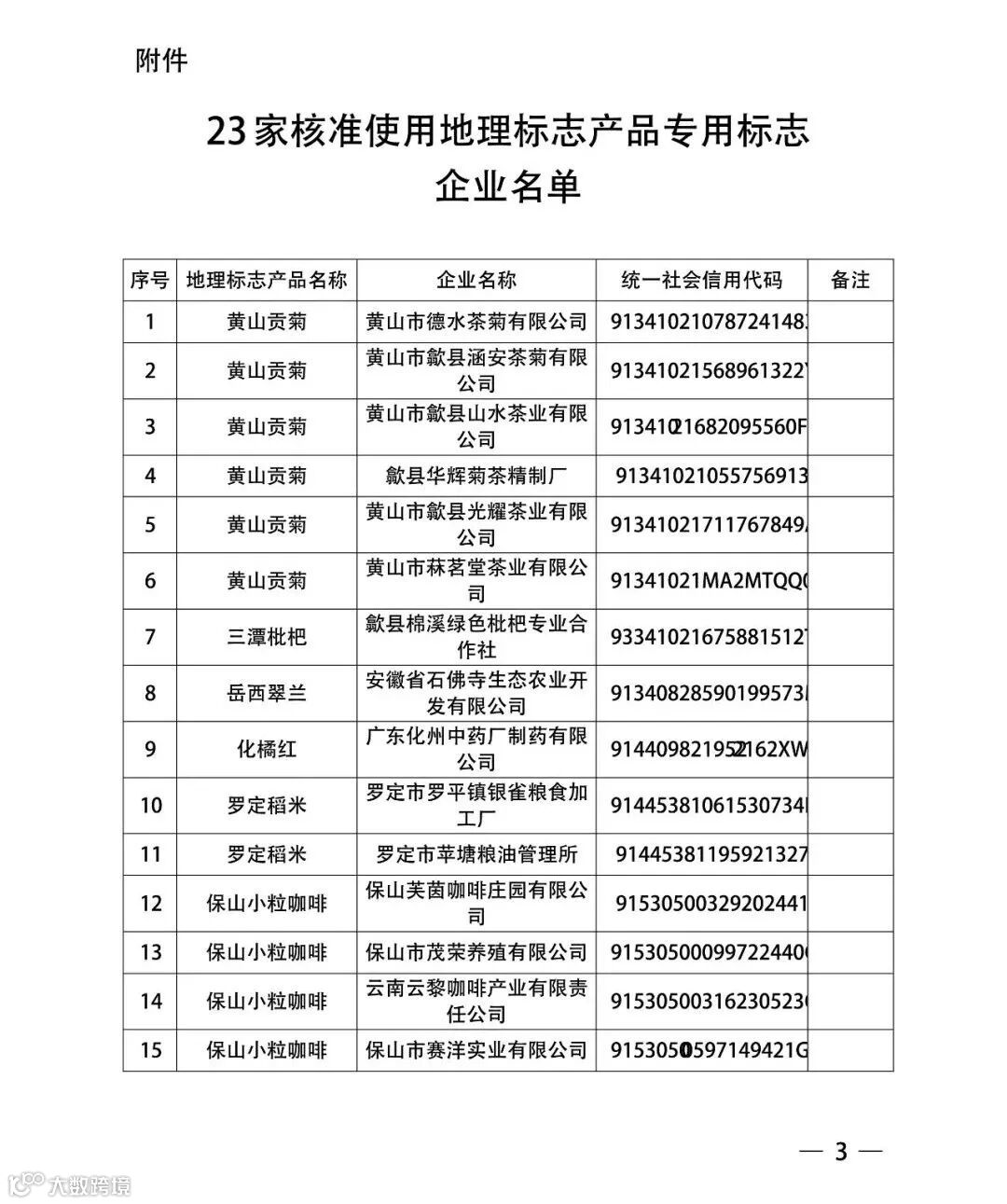 国家知识产权局关于核准黄山市德水茶菊有限公司等23家企业使用地理标志产品专用标志的公告