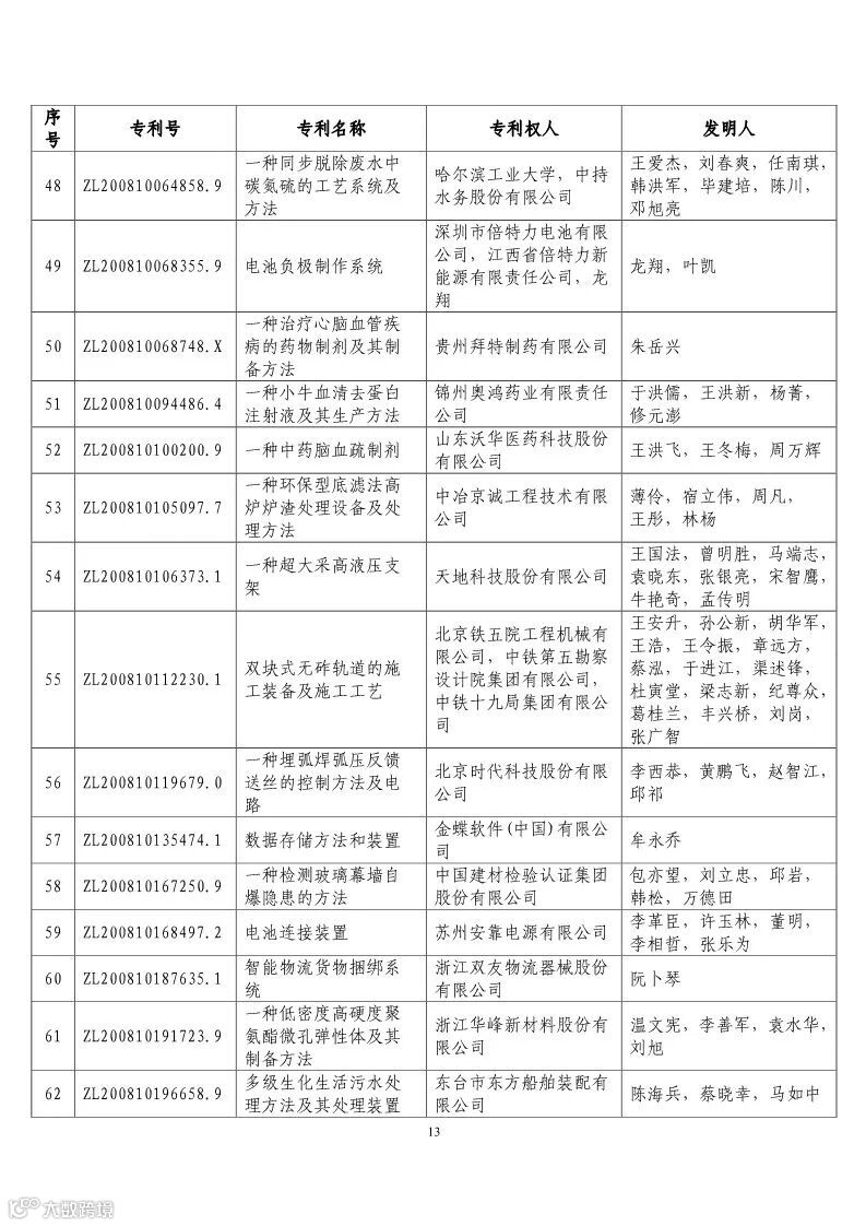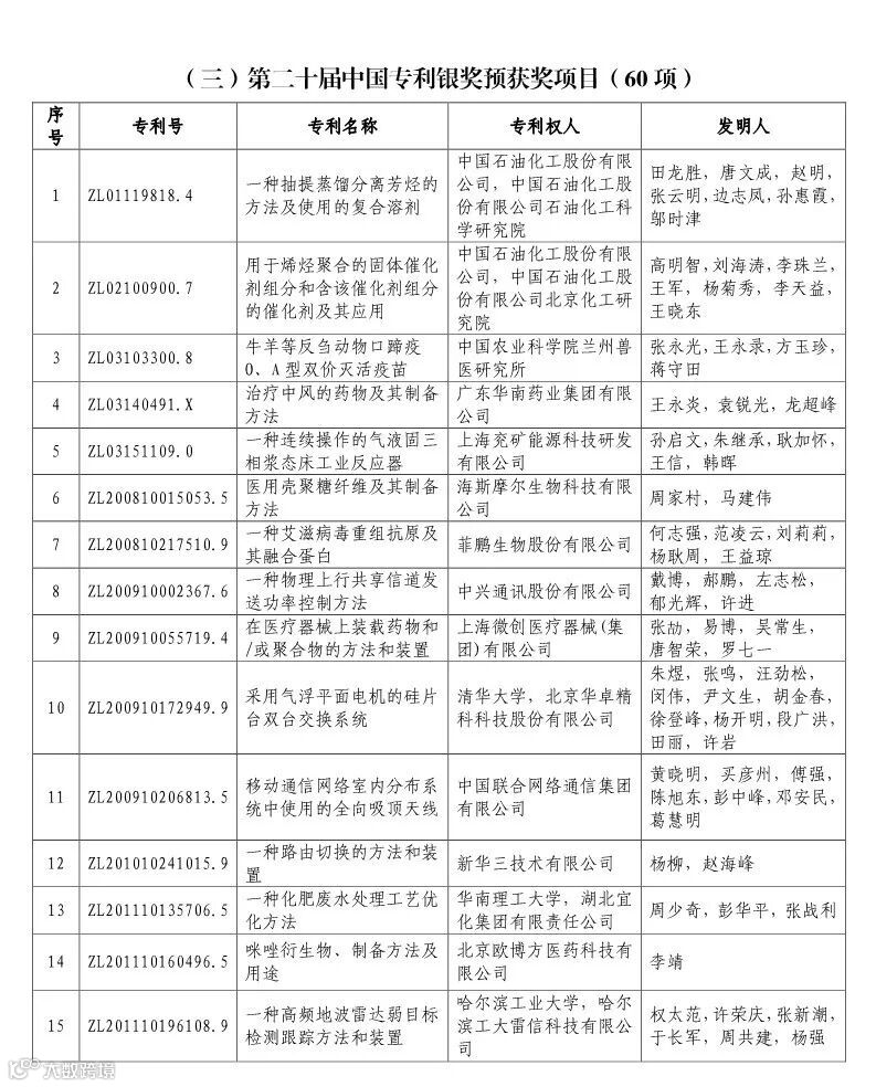 (三)第二十届中国专利银奖预获奖项目(60 项)