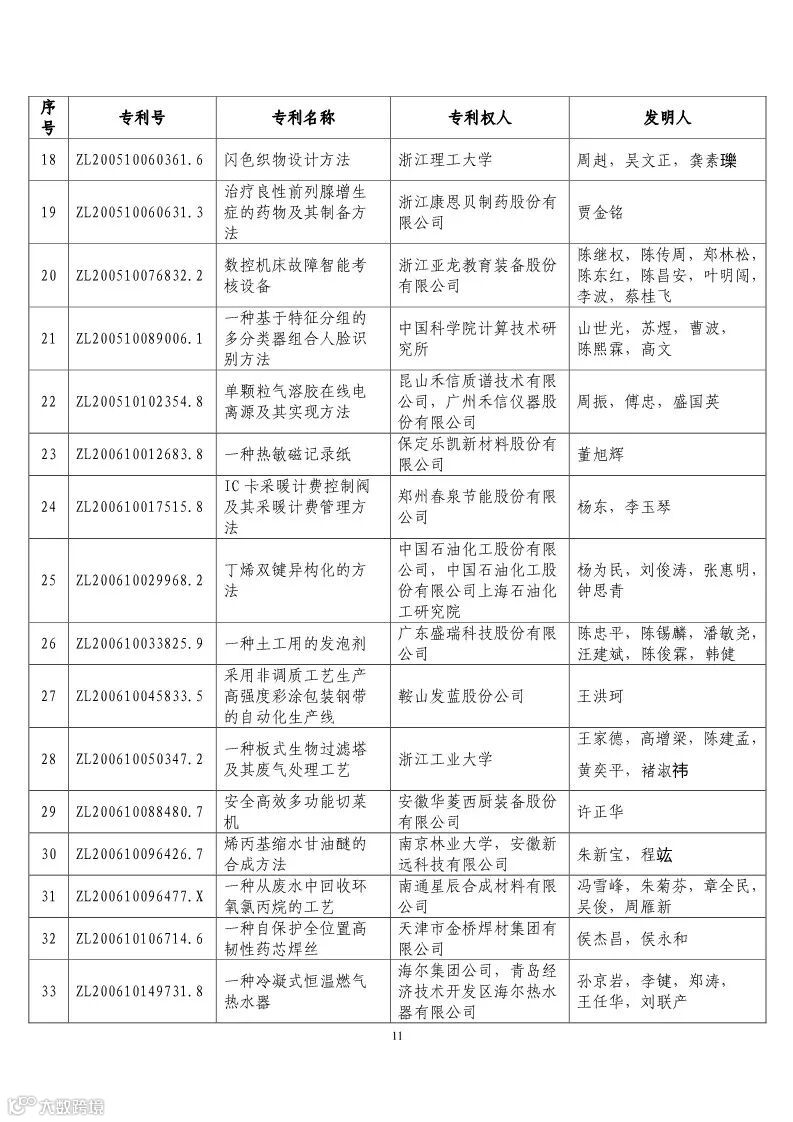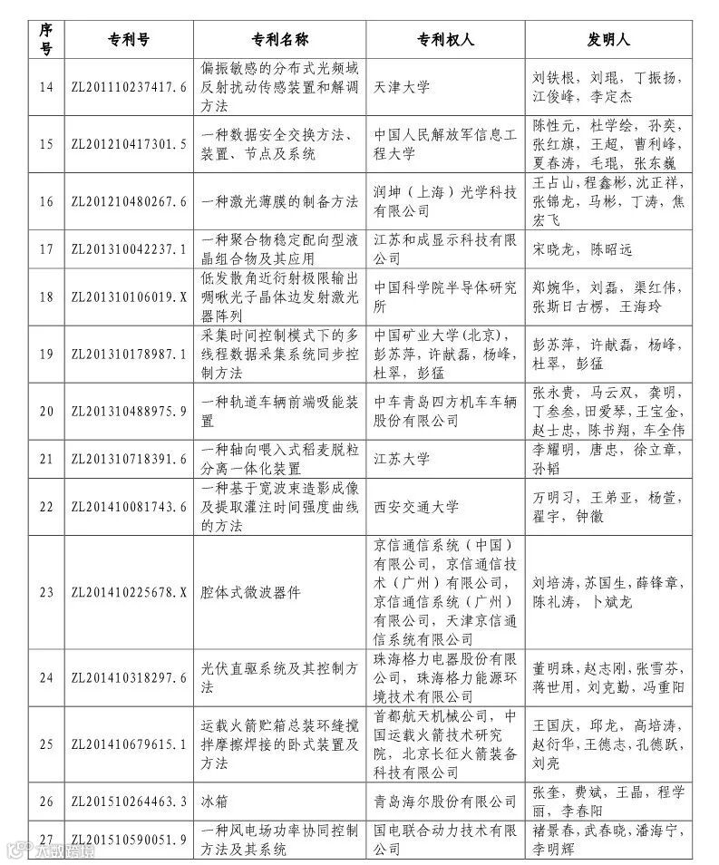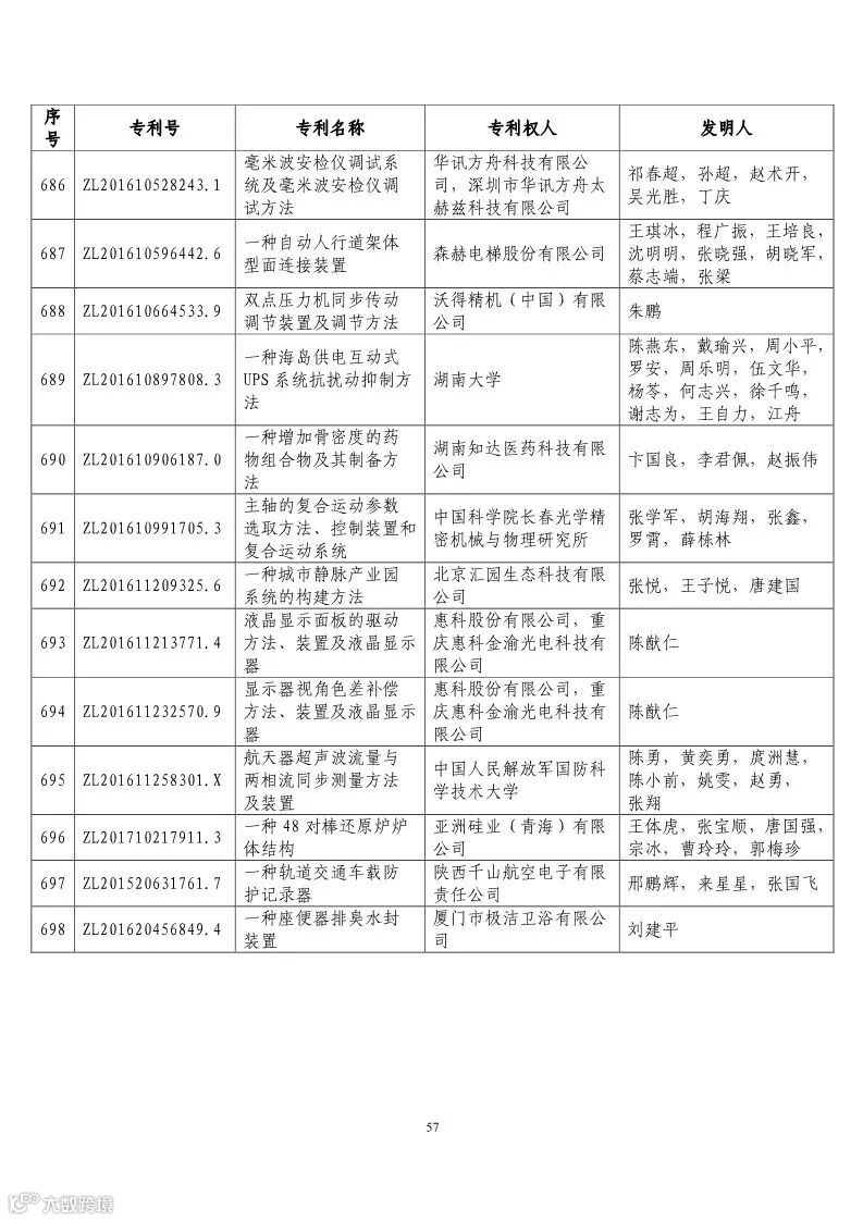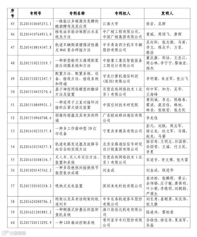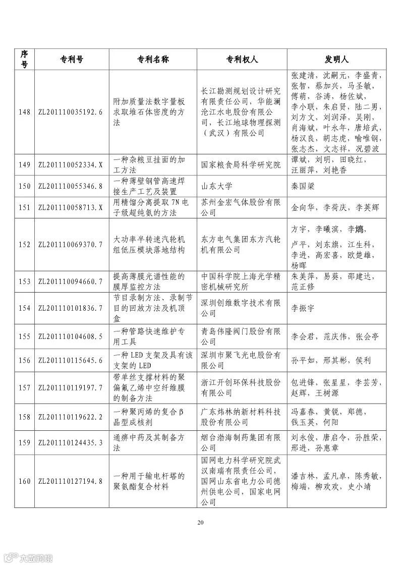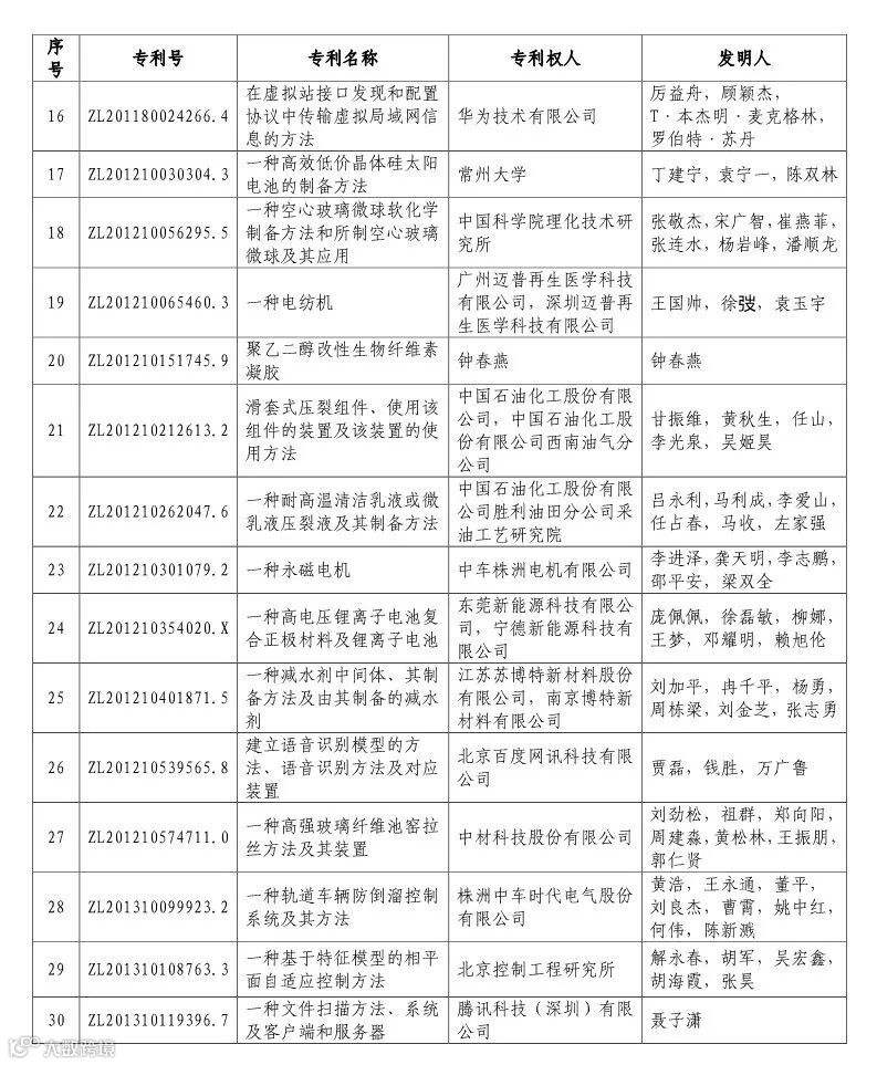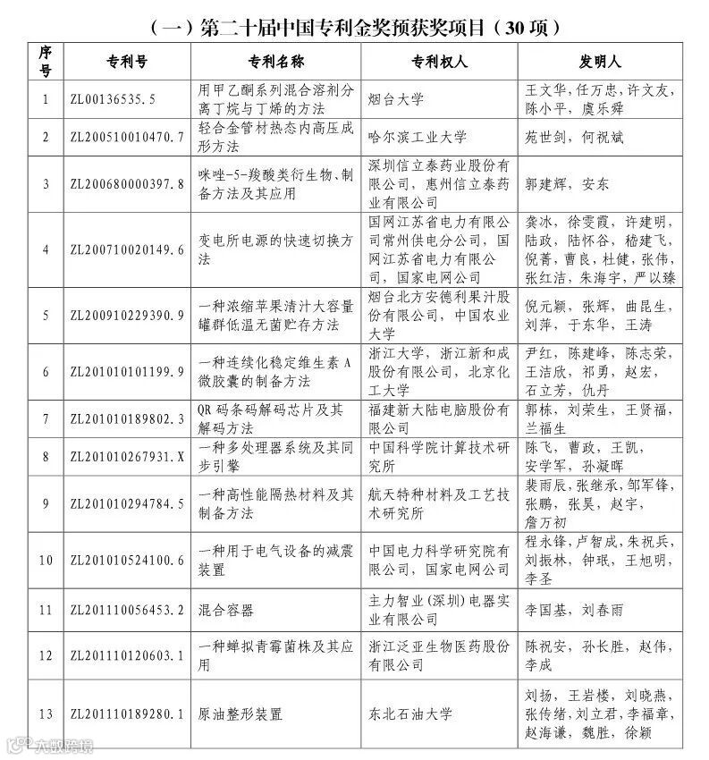 第二十届中国专利奖共评选出中国专利金奖预获奖项目30项,中国外观设计金奖预获奖项目10项,中国专利银奖预获奖项目60项,中国外观设计银奖预获奖项目15项,中国专利优秀奖预获奖项目698项,中国外观设计优秀奖预获奖项目61项,现予以公示,公示期为2018年11月23日至11月29日。