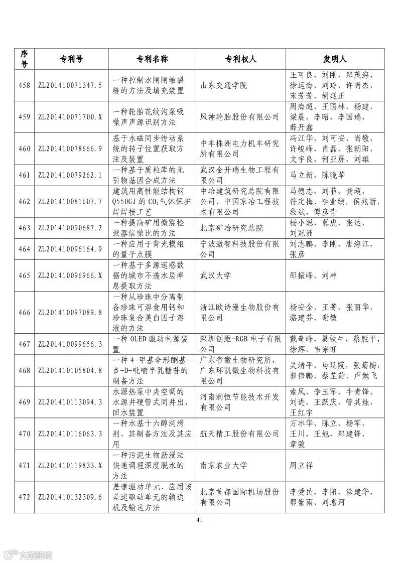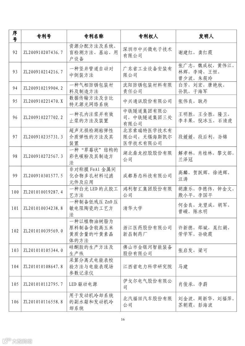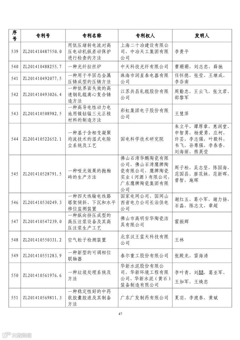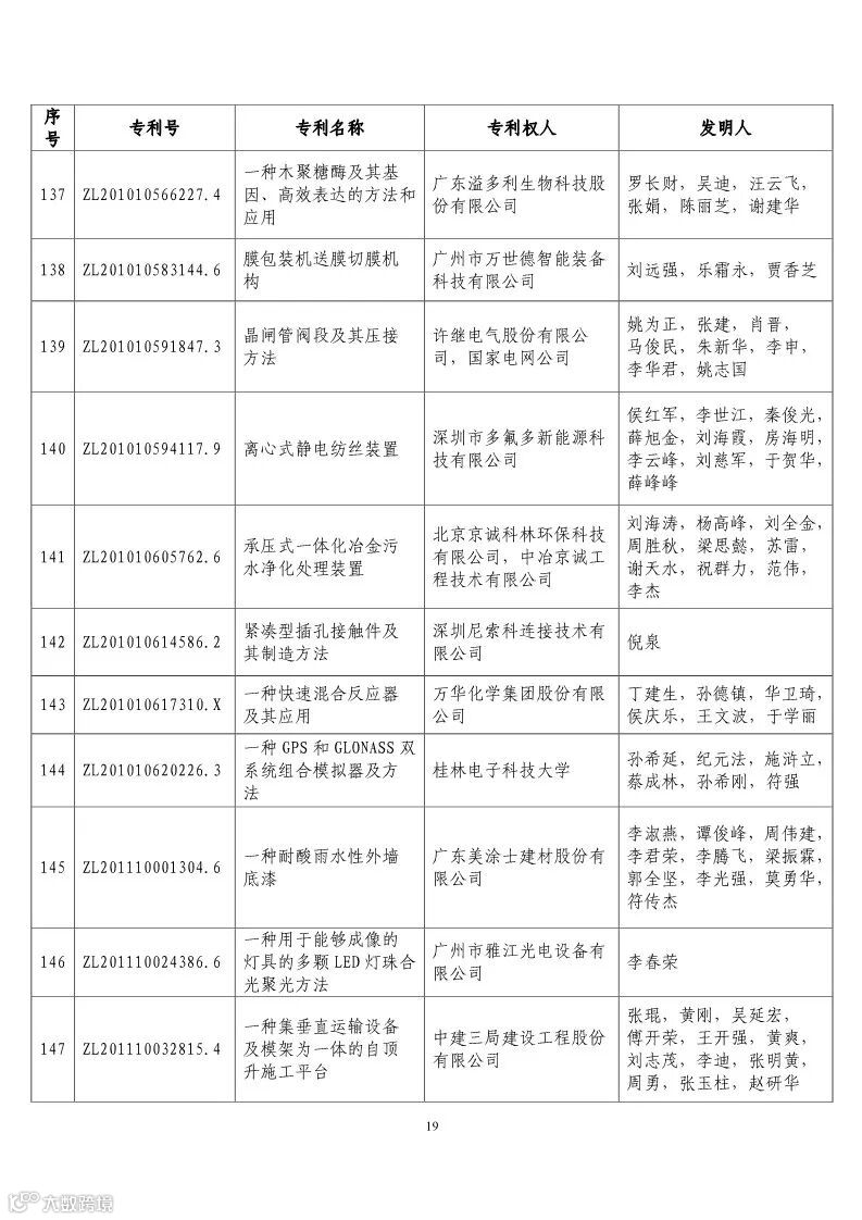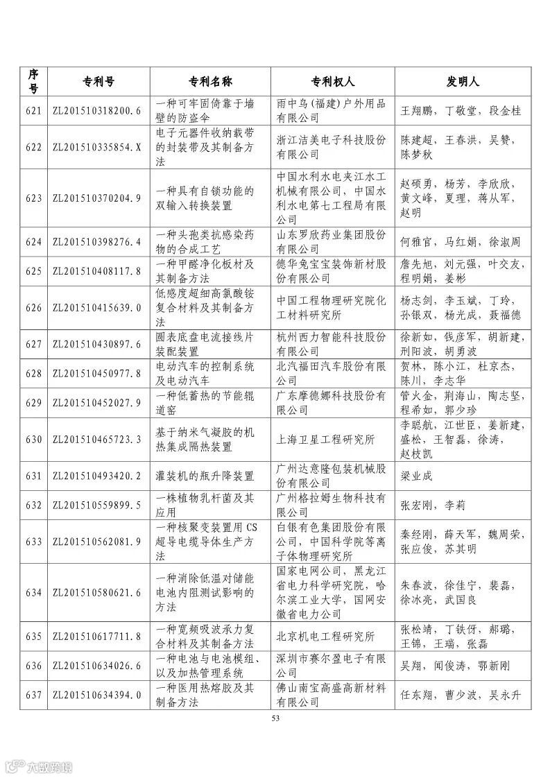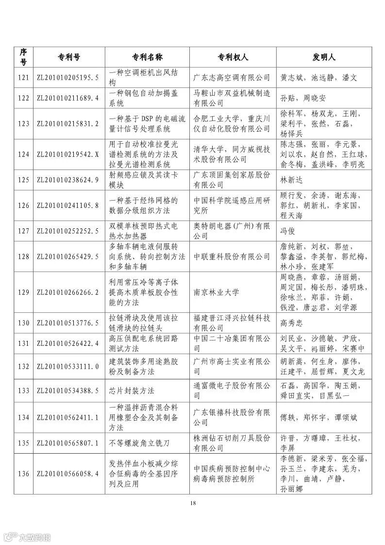 第二十届中国专利奖共评选出中国专利金奖预获奖项目30项,中国外观设计金奖预获奖项目10项,中国专利银奖预获奖项目60项,中国外观设计银奖预获奖项目15项,中国专利优秀奖预获奖项目698项,中国外观设计优秀奖预获奖项目61项,现予以公示,公示期为2018年11月23日至11月29日。