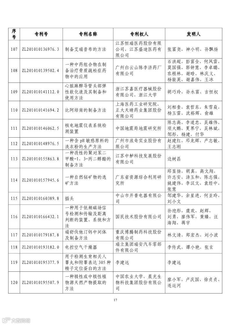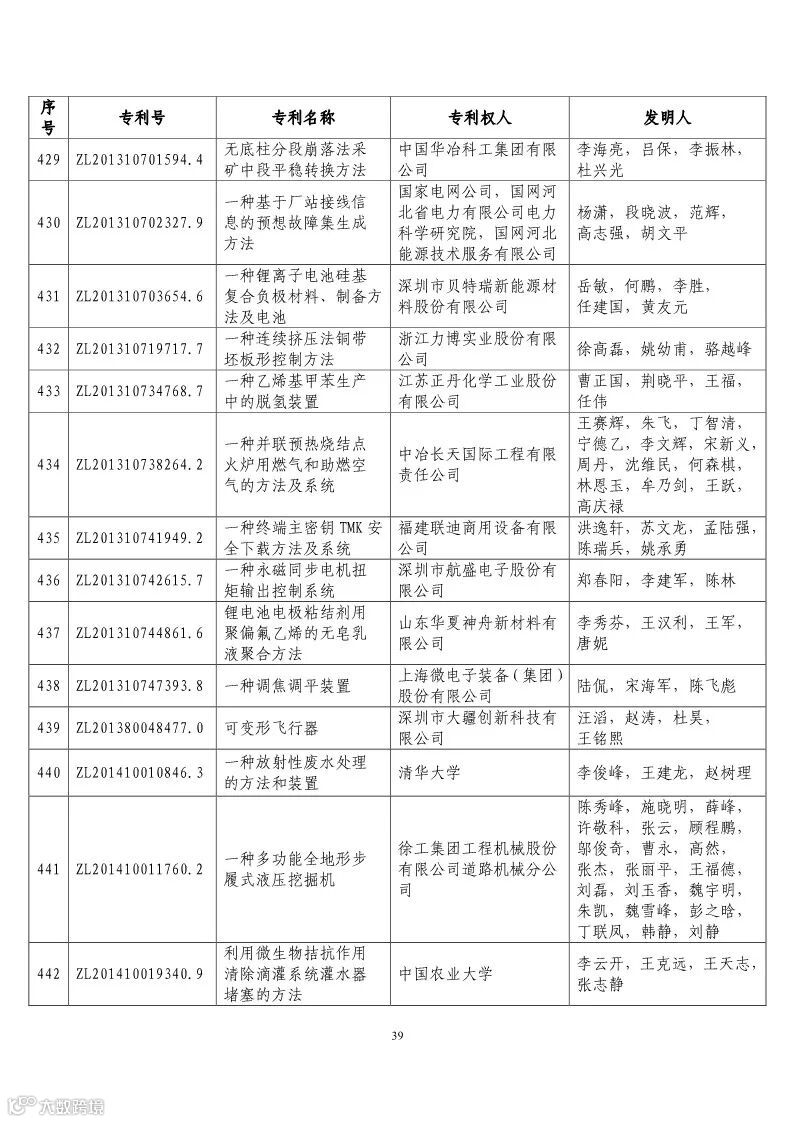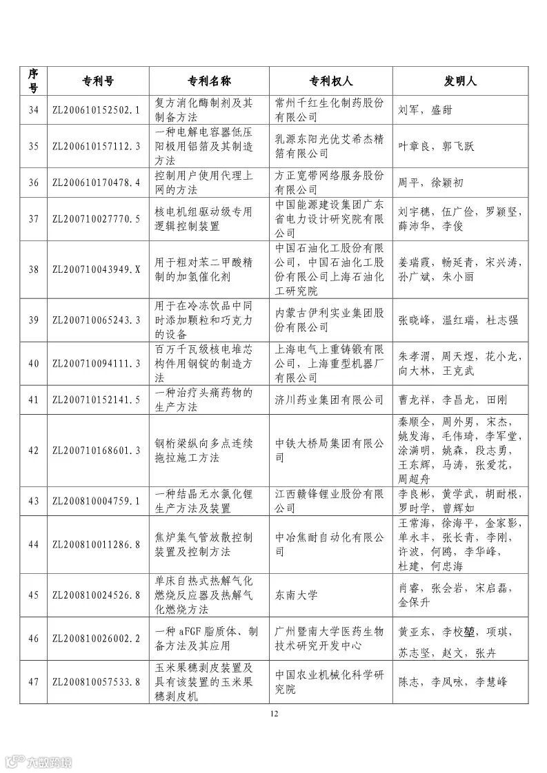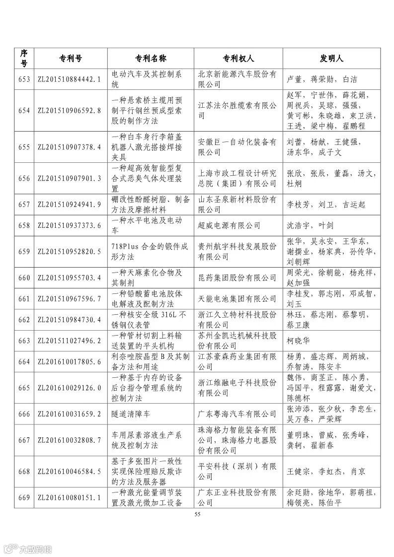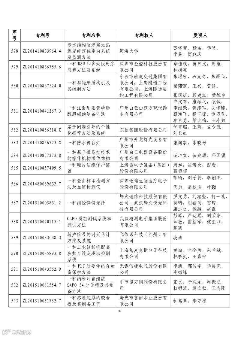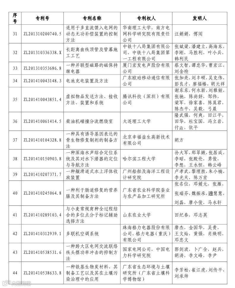 第二十届中国专利奖共评选出中国专利金奖预获奖项目30项,中国外观设计金奖预获奖项目10项,中国专利银奖预获奖项目60项,中国外观设计银奖预获奖项目15项,中国专利优秀奖预获奖项目698项,中国外观设计优秀奖预获奖项目61项,现予以公示,公示期为2018年11月23日至11月29日。