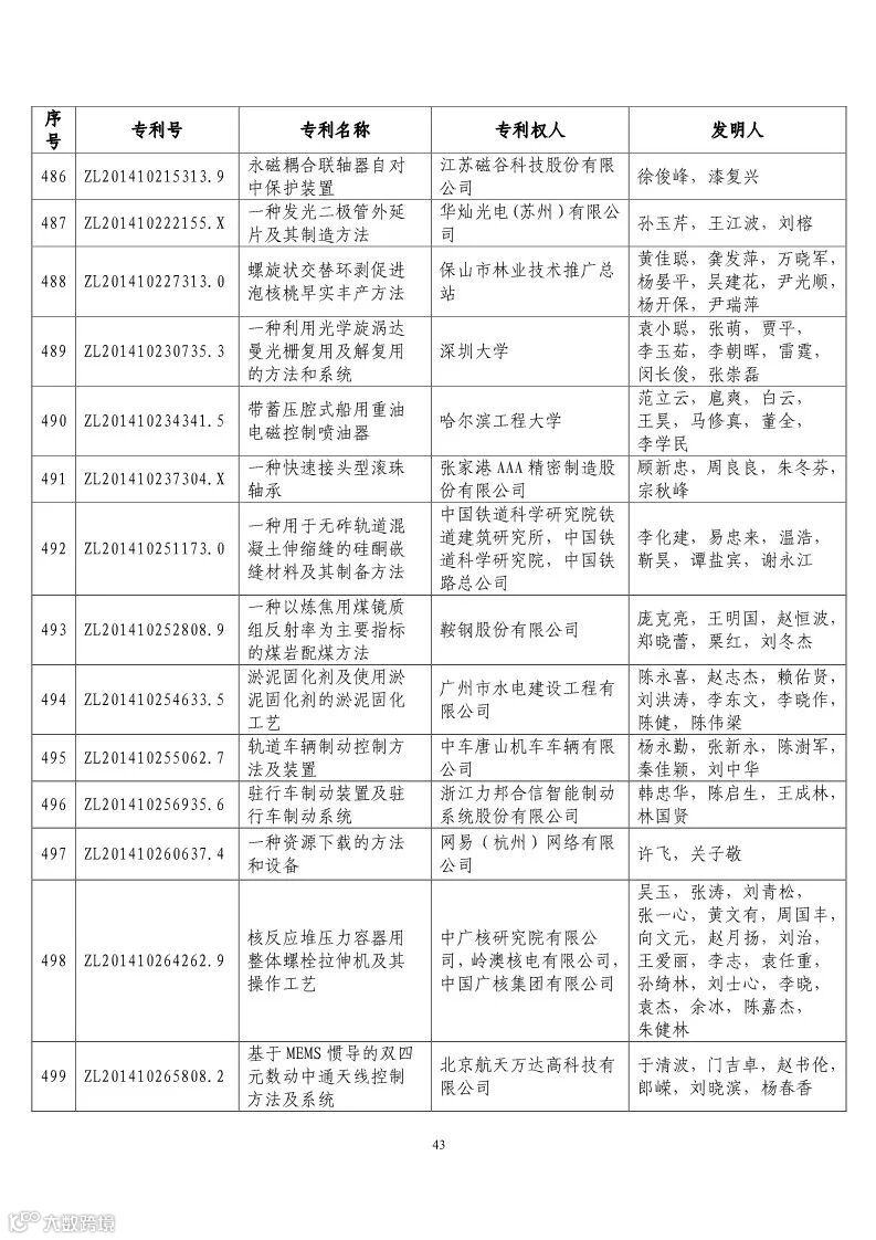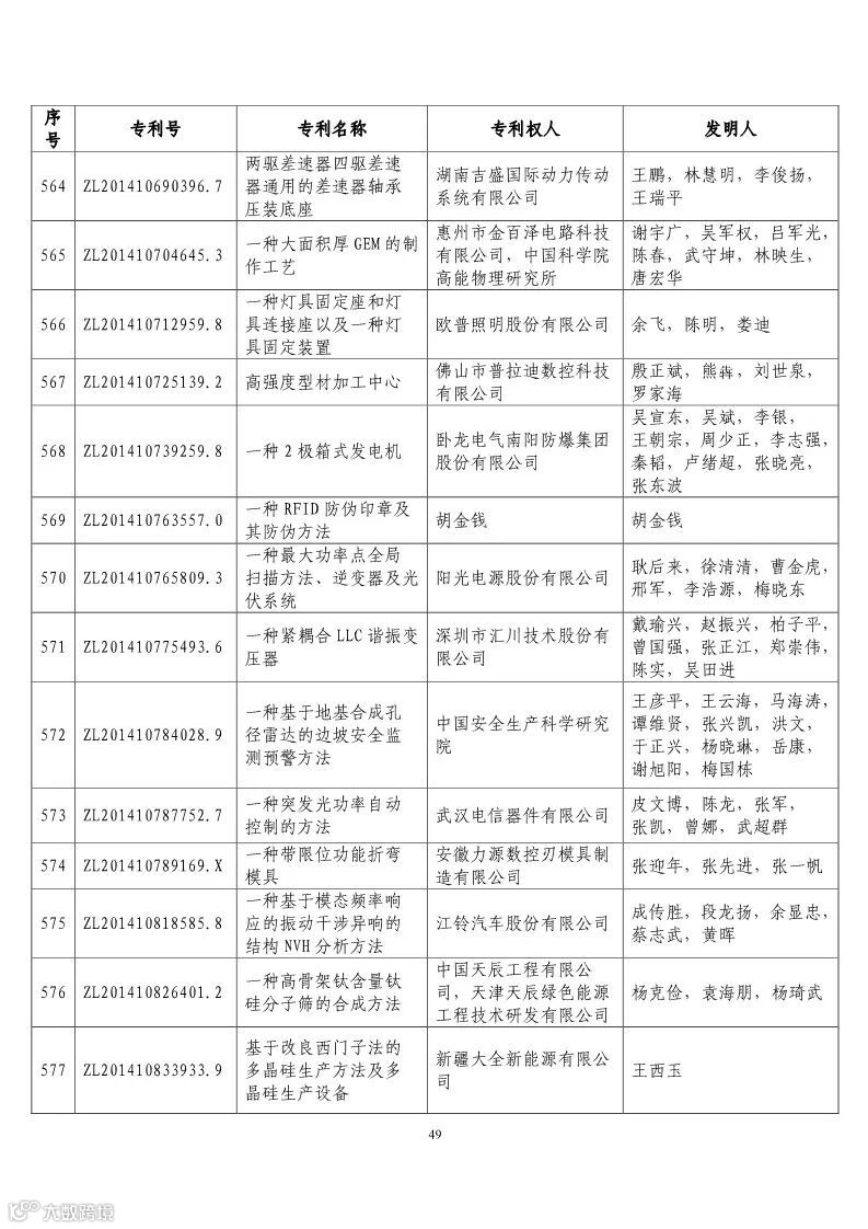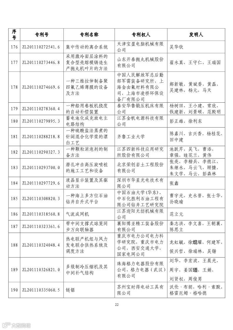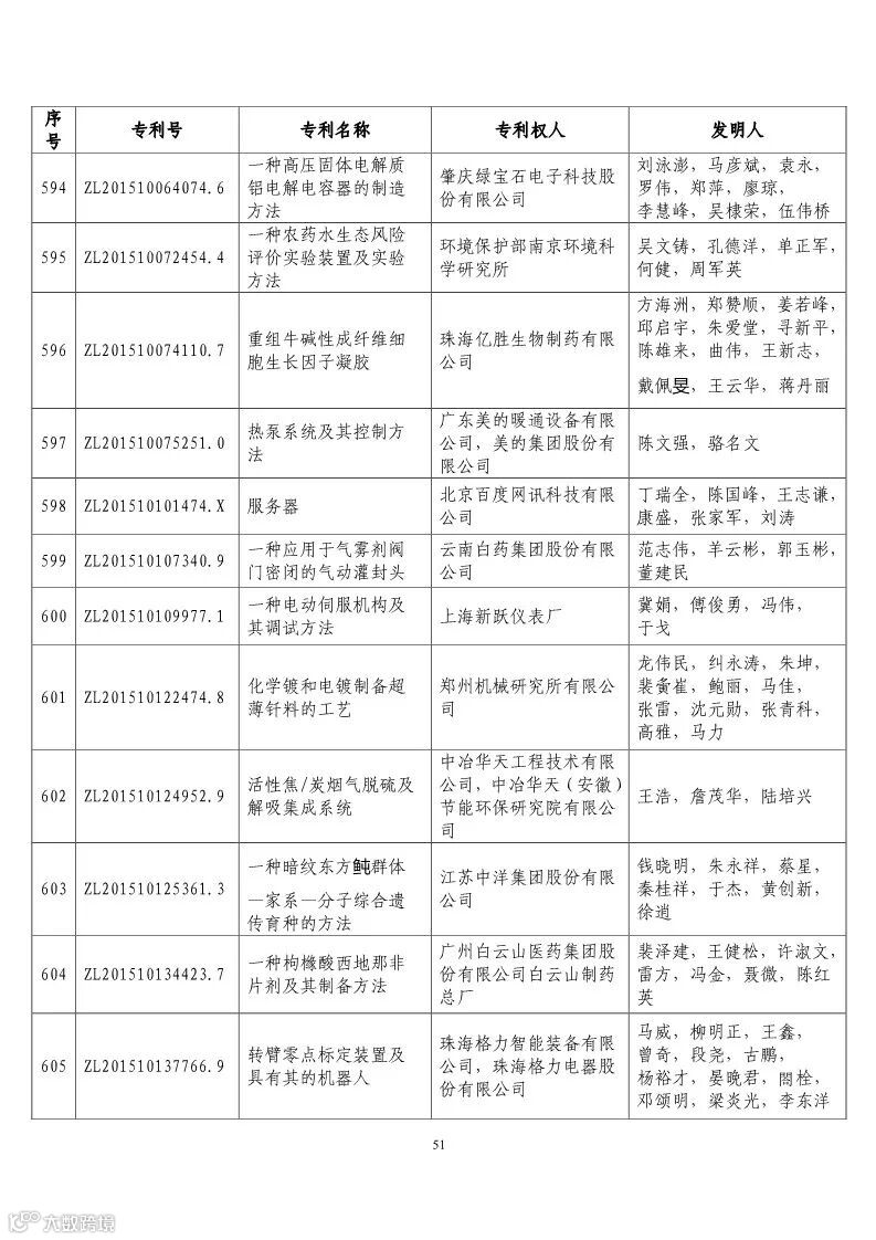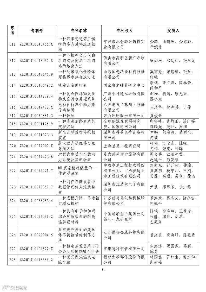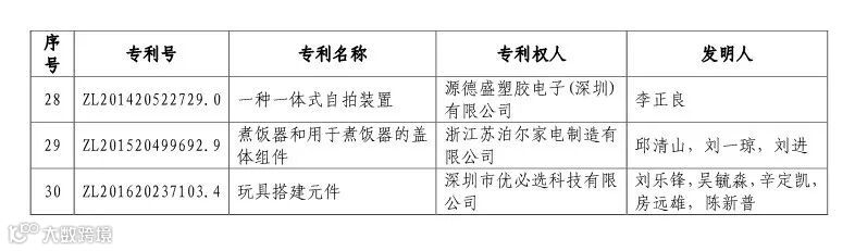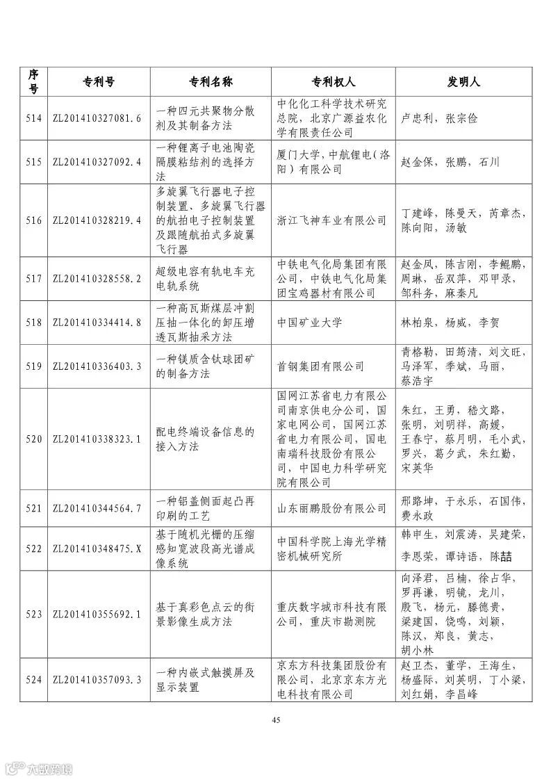 第二十届中国专利奖共评选出中国专利金奖预获奖项目30项,中国外观设计金奖预获奖项目10项,中国专利银奖预获奖项目60项,中国外观设计银奖预获奖项目15项,中国专利优秀奖预获奖项目698项,中国外观设计优秀奖预获奖项目61项,现予以公示,公示期为2018年11月23日至11月29日。