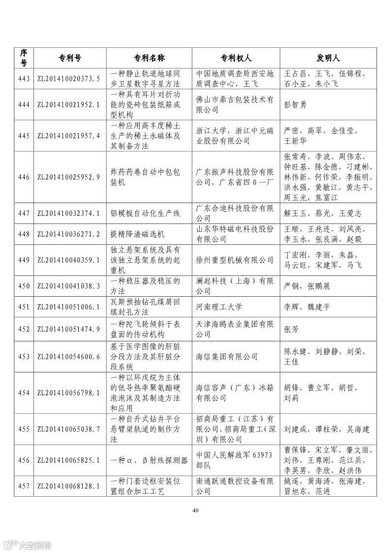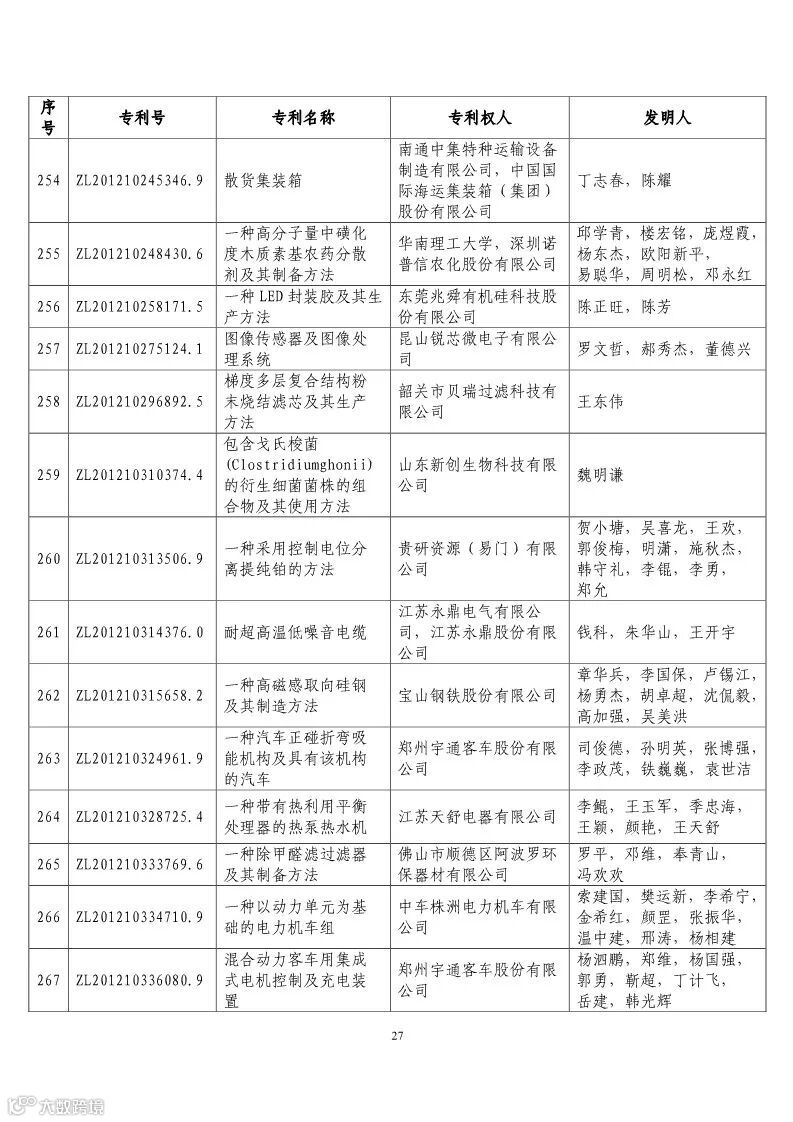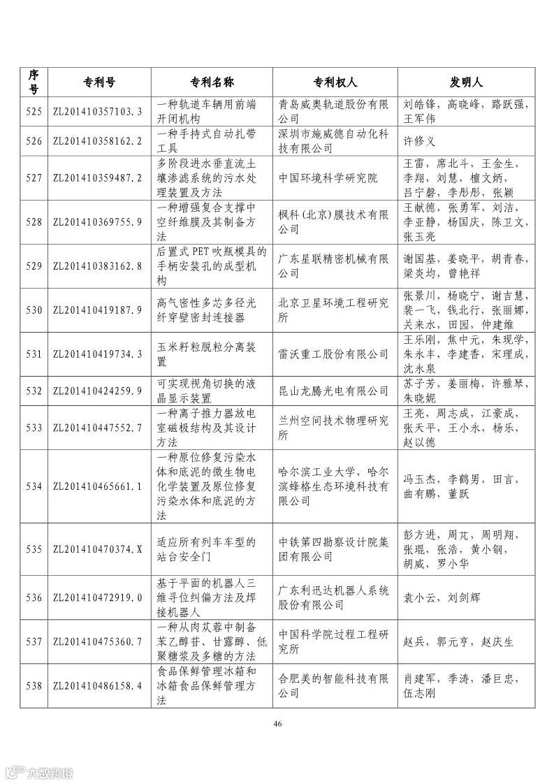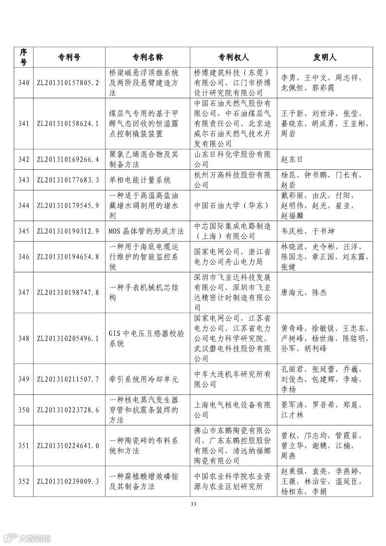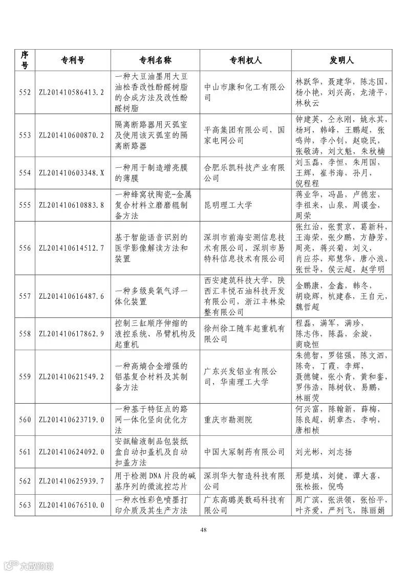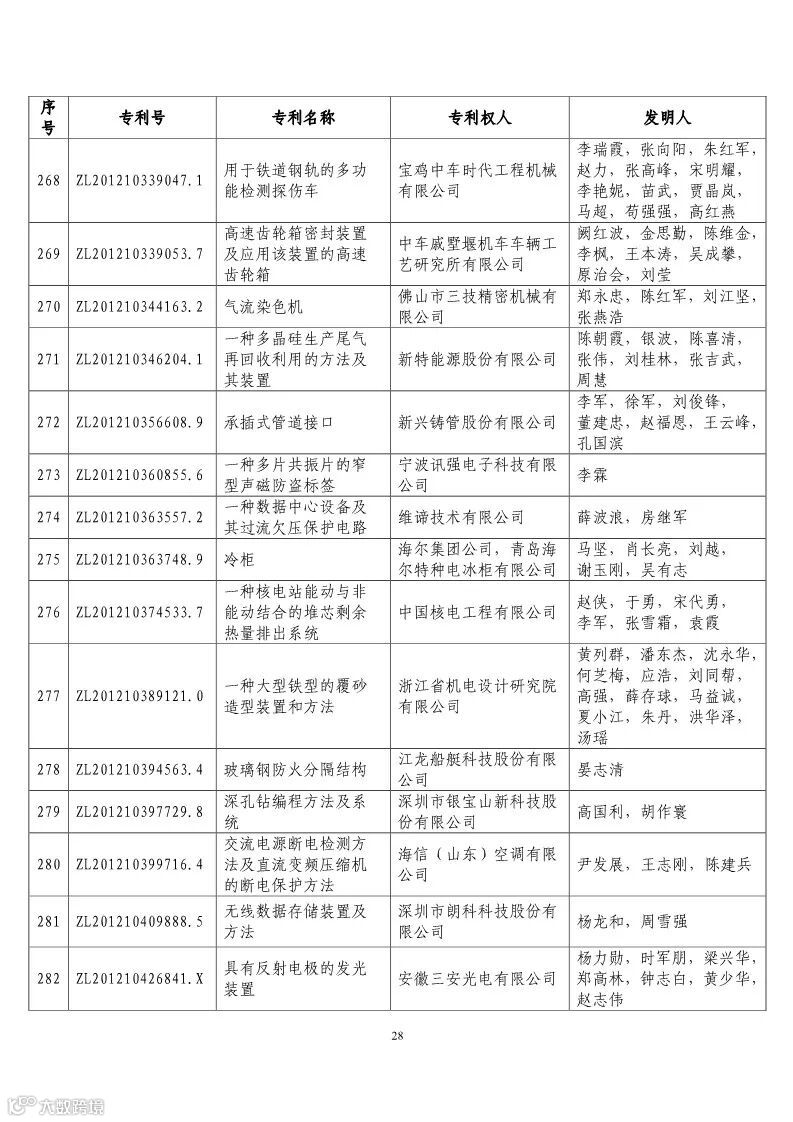 第二十届中国专利奖共评选出中国专利金奖预获奖项目30项,中国外观设计金奖预获奖项目10项,中国专利银奖预获奖项目60项,中国外观设计银奖预获奖项目15项,中国专利优秀奖预获奖项目698项,中国外观设计优秀奖预获奖项目61项,现予以公示,公示期为2018年11月23日至11月29日。