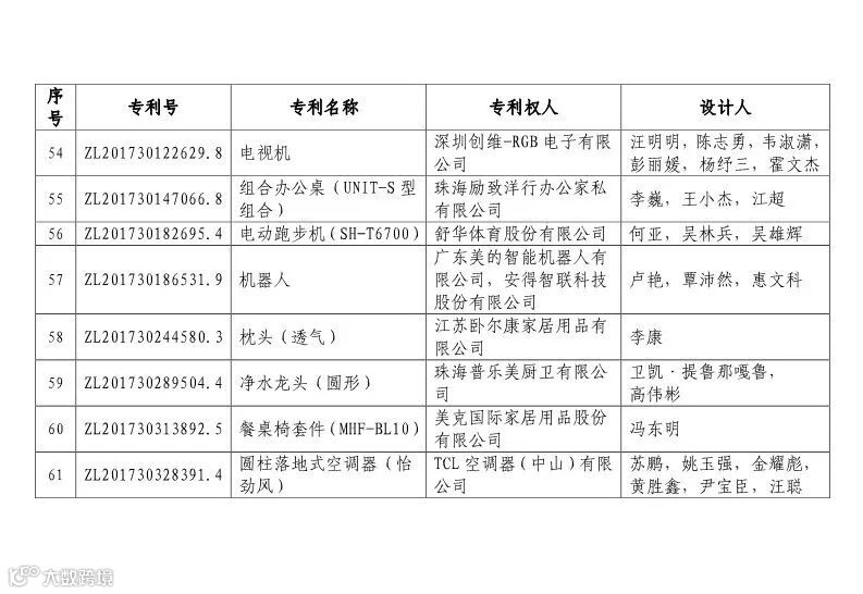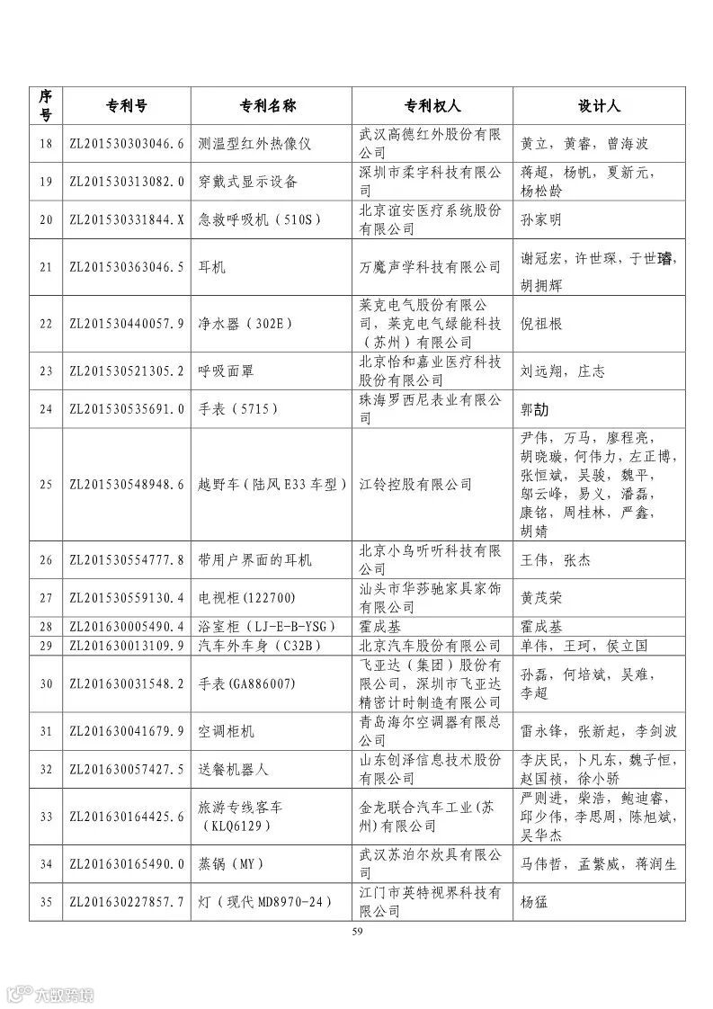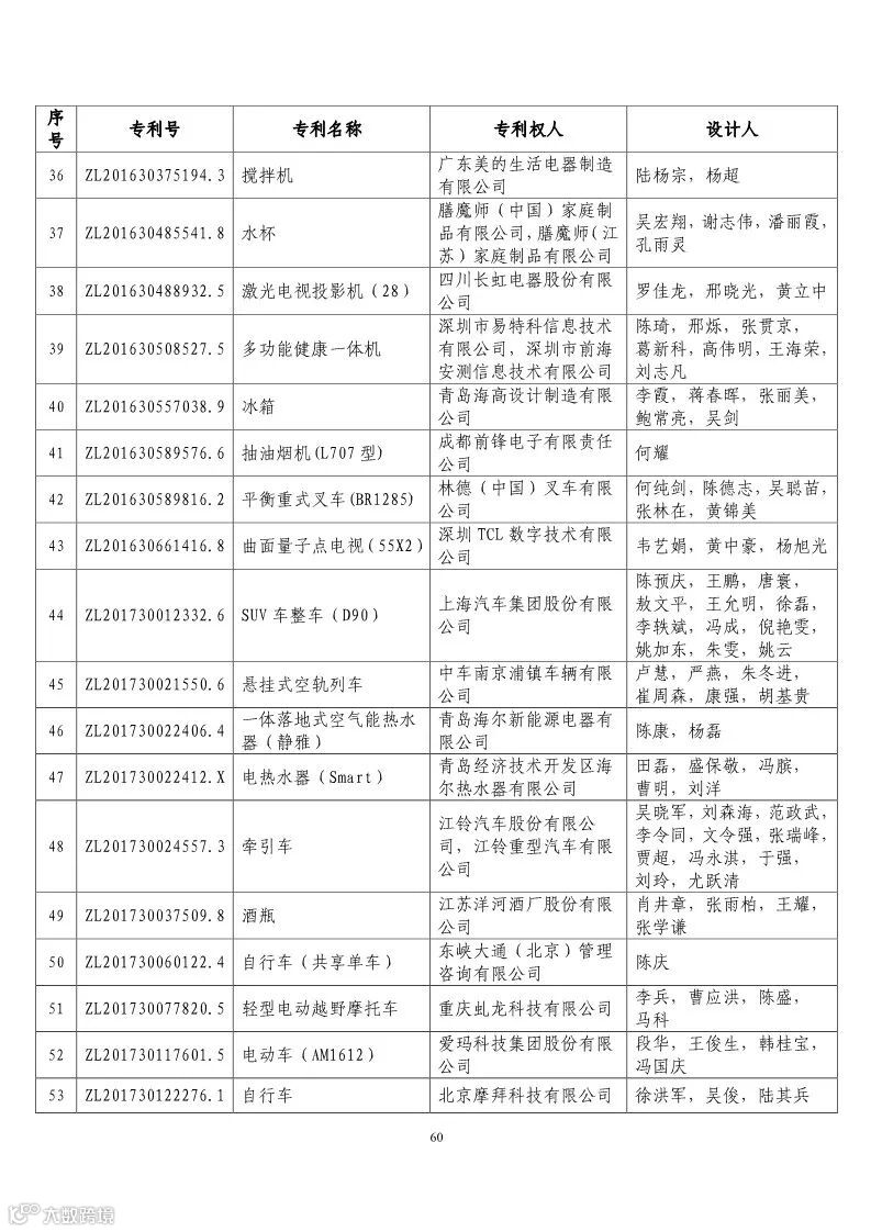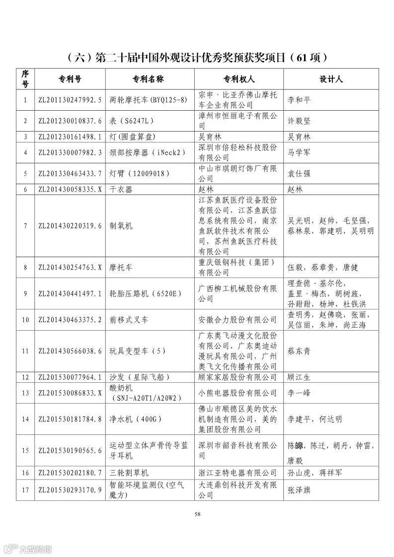 (六)第二十届中国外观设计优秀奖预获奖项目(61 项)