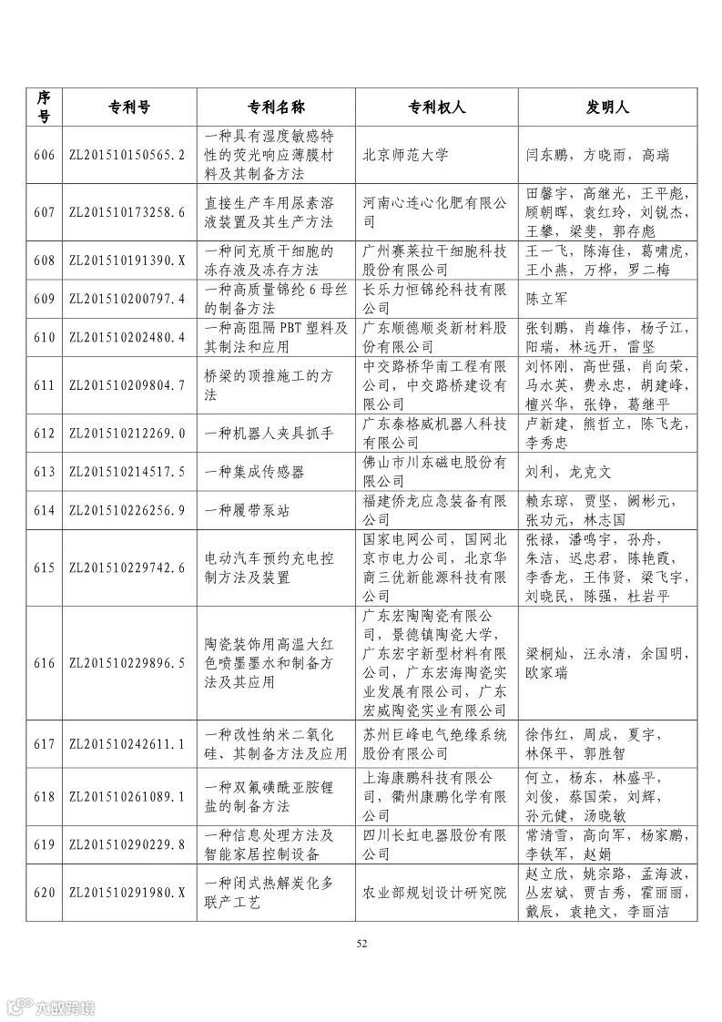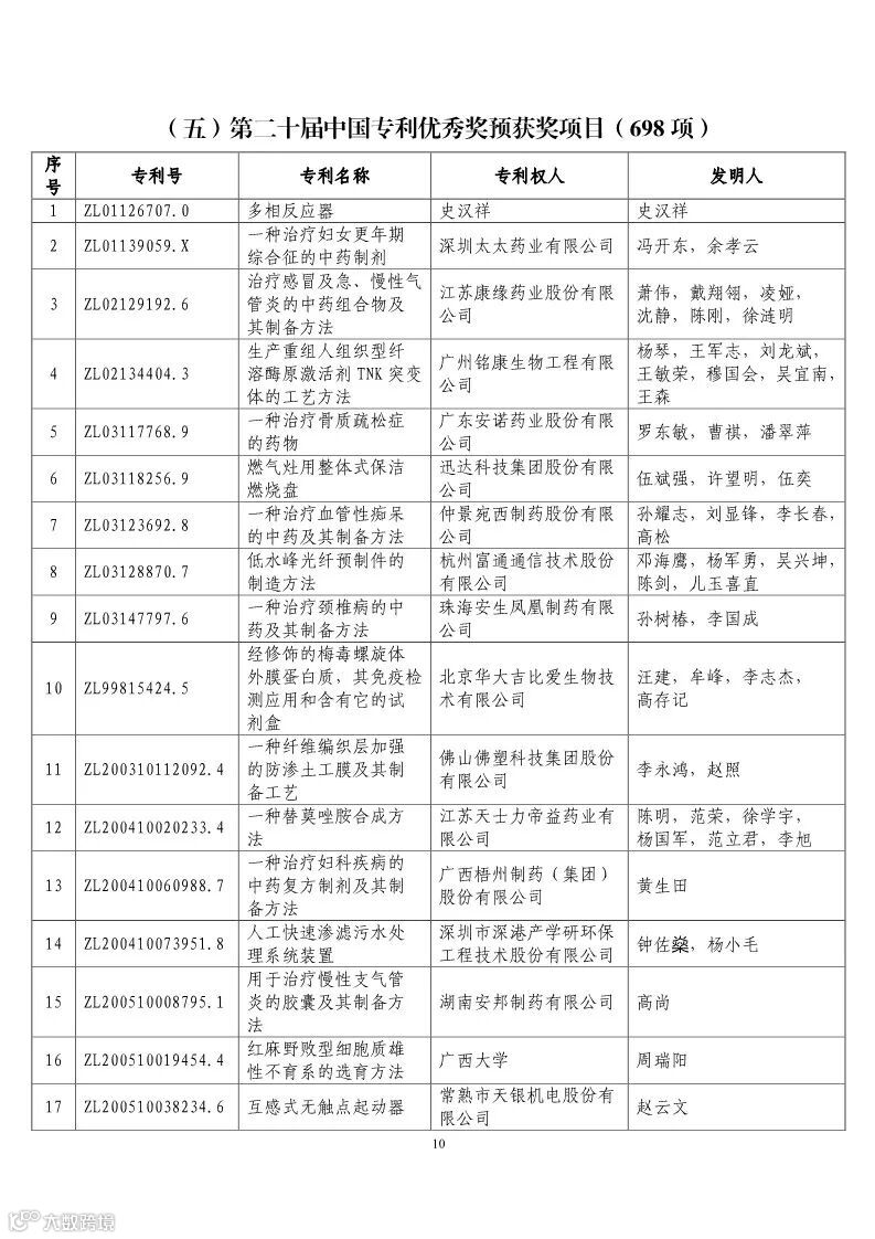 (五)第二十届中国专利优秀奖预获奖项目(698 项)