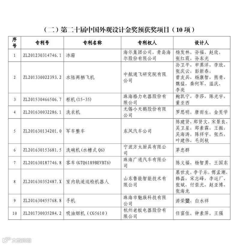 (二)第二十届中国外观设计金奖预获奖项目(10 项)