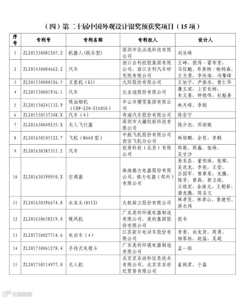 (四)第二十届中国外观设计银奖预获奖项目(15 项)