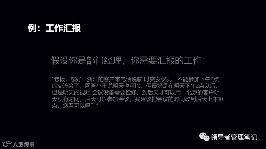案例优化:原汇报中“浙江客户突发状况、北京客户明天没空、设备需检修”可整合为: