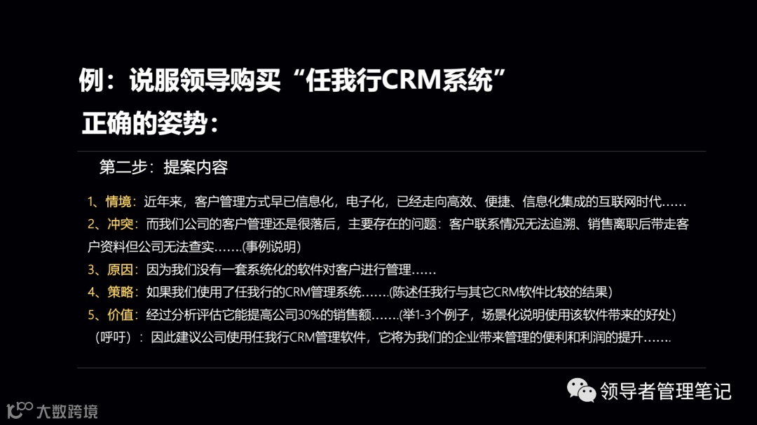 | 要素 | 定义与核心作用 | 关键要求 | 案例延伸(说服领导采购CRM系统) |
