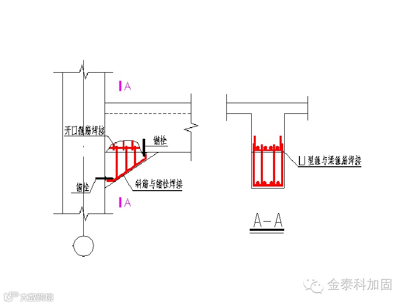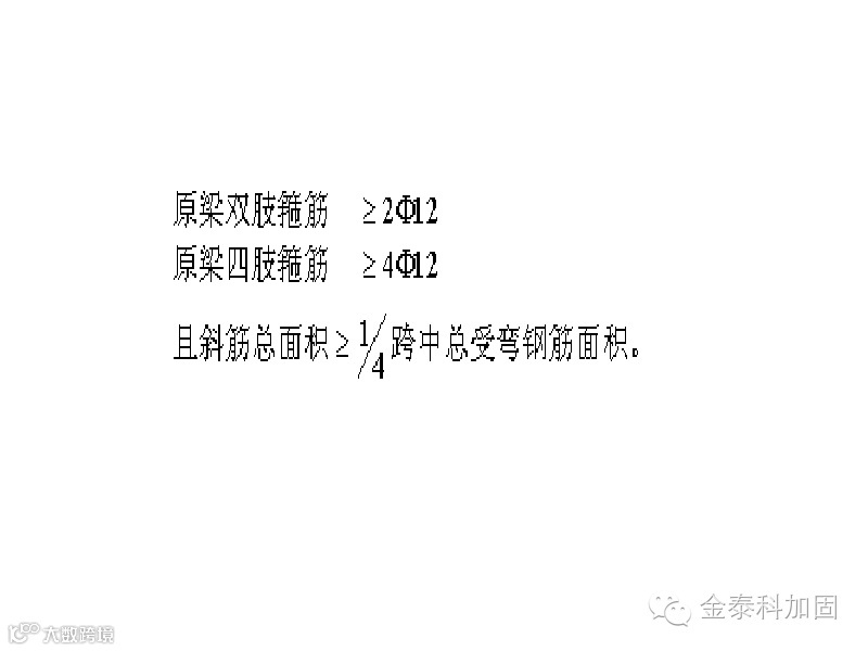 凿开原梁加腋部分梁底保护层露出箍筋,按相同钢筋及间距焊接开口箍筋。