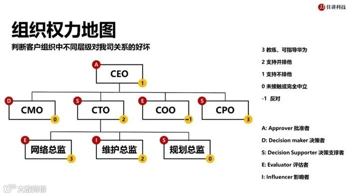 标注客户组织架构、决策角色、关系强度(颜色编码)、责任人和赞助人;