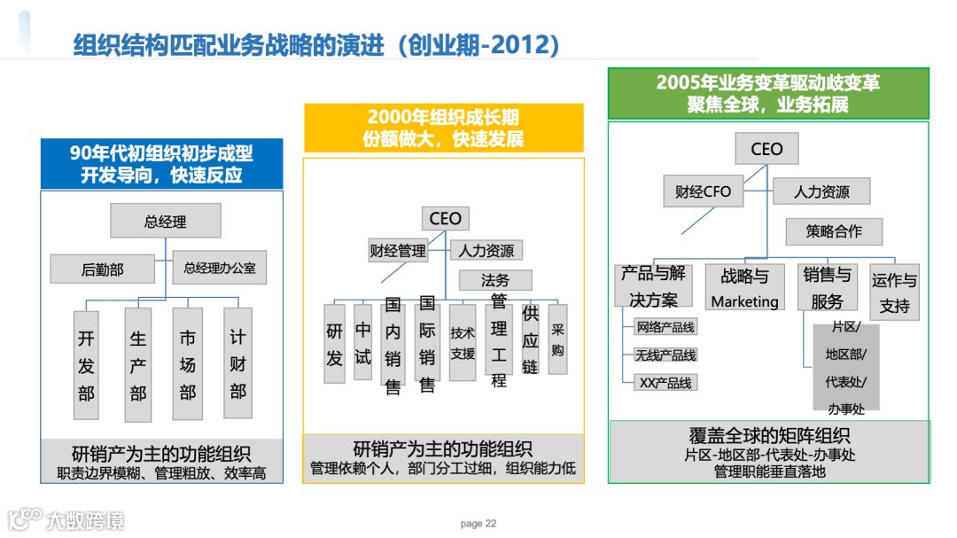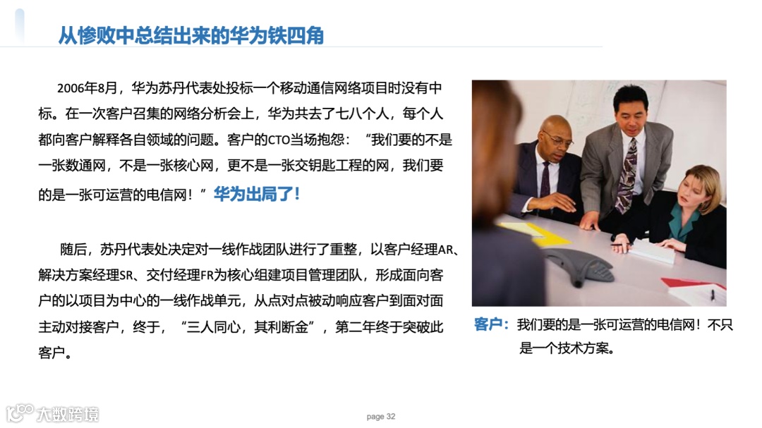 创新:按“片区+BG”划分,如西欧片区下设运营商BG、企业BG,每个BG配备“客户经理+产品经理”组合,典型案例:2007年海外市场突破,铁三角雏形出现。