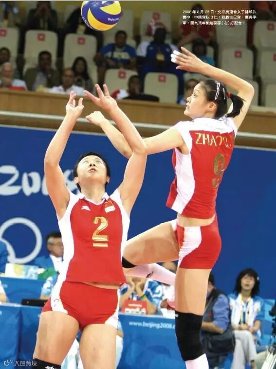 2008年8月23日,北京奧運會女子排球決賽中,中國隊以3比1戰勝古巴隊,獲得季軍。圖為馮坤和趙蕊蕊(右)打配合。
