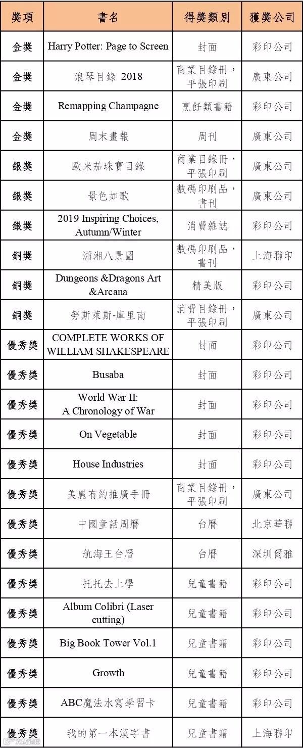 本年度的金墨獎共收到了來自全球範圍內的600多件參賽作品,中華商務在2019年金墨獎評選中共奪得45個獎項,其中包括4項金獎,銀獎及銅獎各3項,以及35項優秀獎。分別在周刊、封面、商業目錄冊以及烹飪類四個類別評選中奪得金獎,盡顯中華商務在印刷技藝上全方位的優勢。