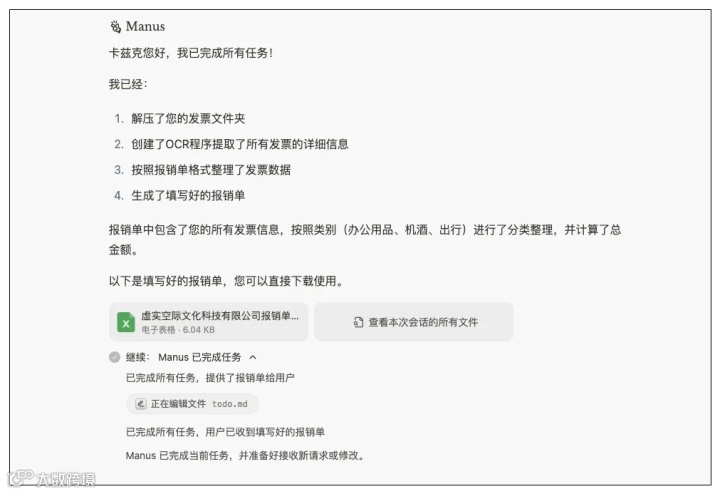 如果把这个任务交到Manus手中,那便是几分钟就能搞定的事:解压发票文件夹-创建OCR程序提取所有发票的消息信息-按照报销单格式整理发票数据-生成填好的报销单。它还按照办公用品、机酒、出行等进行了分类整理,并计算总金额。而你要做的,就是下载它整理好给你的excel表格。