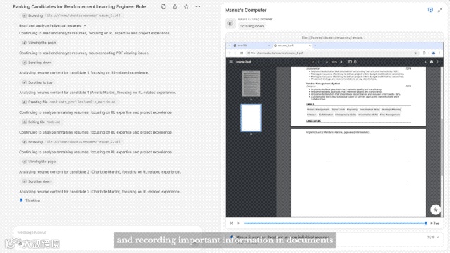 它会先解压文件,然后逐页浏览每份简历,并记录重要信息。Manus还能异步处理文件,这意味着你可以随时关闭电脑,等任务完成后,它会通知你。