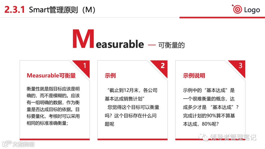 错误指标示例 问题分析 修正方案 “提高员工积极性” 主观不可量化,无法考核 “季度员工主动提案数≥5条/人” “降低成本” 未明确范围与幅度 “2024年办公能耗降低12%” “提升产品质量” 缺乏具体维度 “次品率从5%降至2%,客户退货率≤1%”