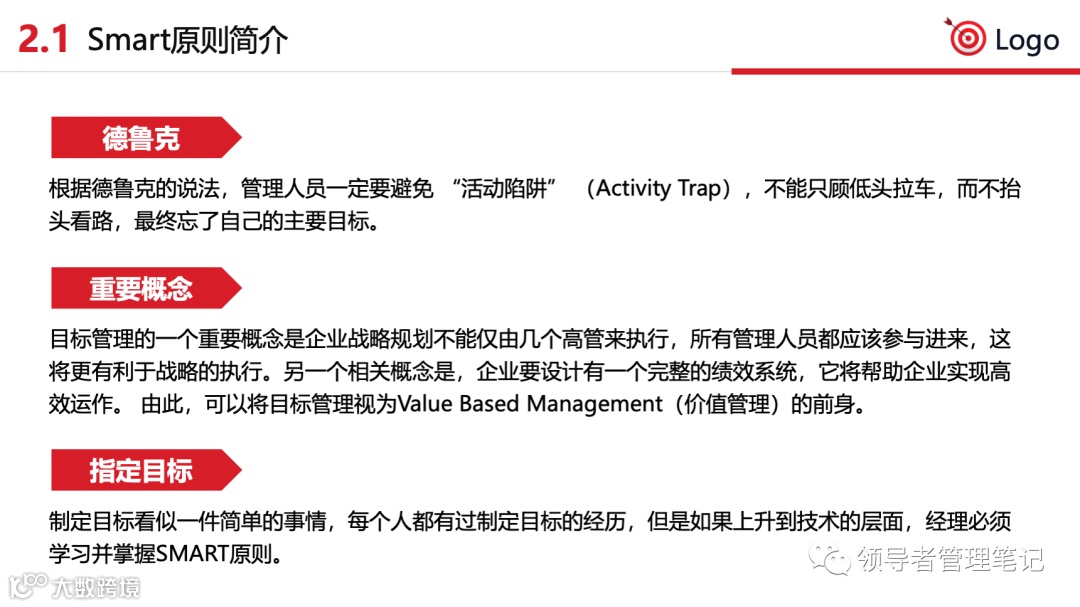起源:1954年德鲁克在《管理实践》中首次提出目标管理(MBO),强调“企业的使命必须转化为目标”。