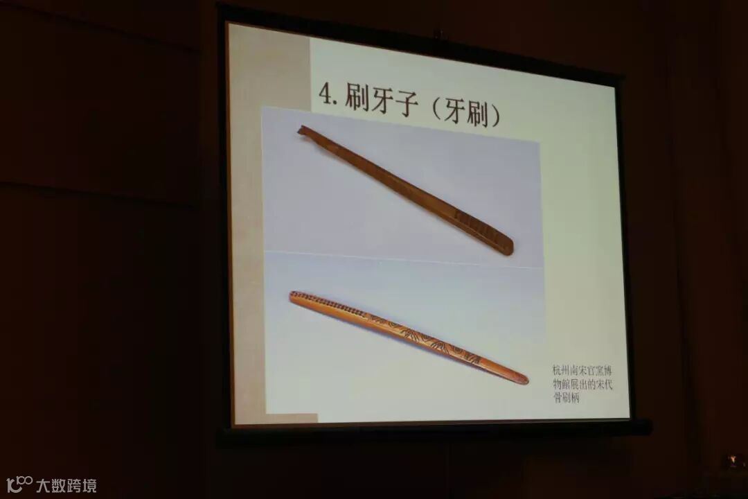 吳鉤又介紹了多種宋人的生活用品,皆叫人嘖嘖稱奇。一種叫「刷牙子」的東西,相當於後來的牙刷,原來早在宋朝已是十分普遍的日用品,屬於在市場上常見的小商品。刷牙子的刷柄多用木頭、竹片甚至獸骨、象牙製造,毛刷的部分則用豬鬃。而今日我們見到的刷牙子都是用獸骨或象牙製,看起來價值不菲,於宋時當為貴族所用,事實上,宋人更多用的是木製的刷牙子,只是木質品難保存,出土文物都是骨製品。