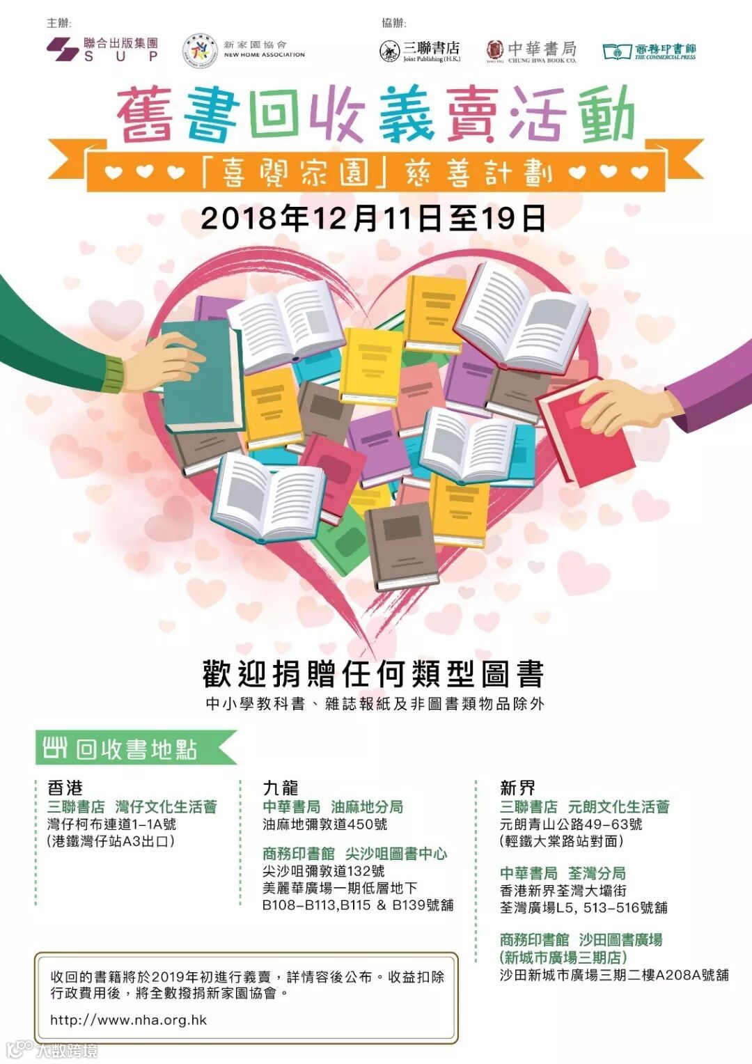自今天始至12月19日,在三聯書店、中華書局及商務印書館港九新界的指定門市,回收市民舊書,交予新家園協會於明年進行義賣。六家回收舊書門市包括: