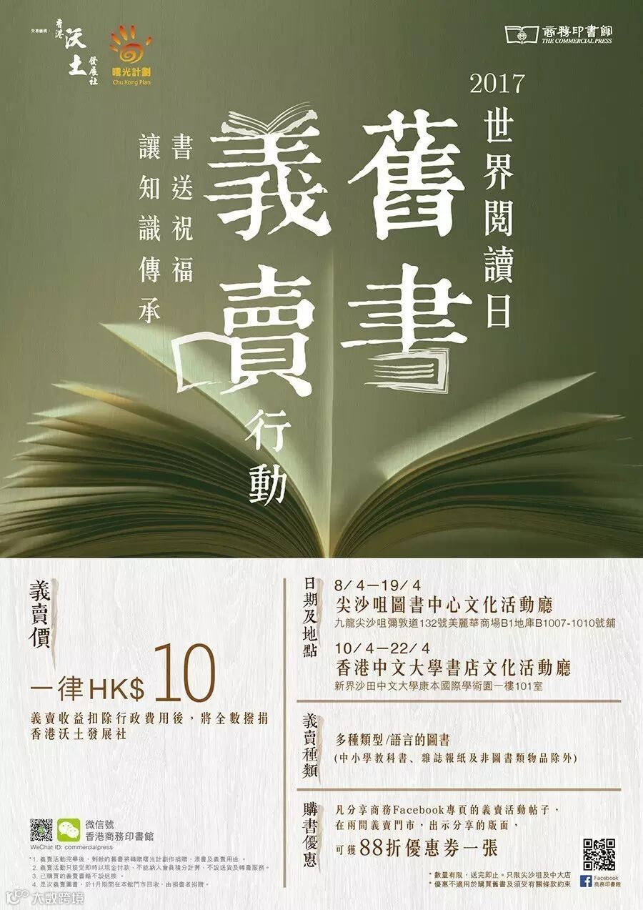 舊書義賣活動由今日起至4月22日期間,於商務印書館尖沙咀圖書中心及香港中文大學書店舉行。所有書籍將一律以每本港幣10元作慈善義賣。活動收益扣除行政費用後,將全數撥捐香港沃土發展社。義賣活動完畢後,剩餘的舊書將轉贈曙光計劃作捐贈、漂書及義賣用途。