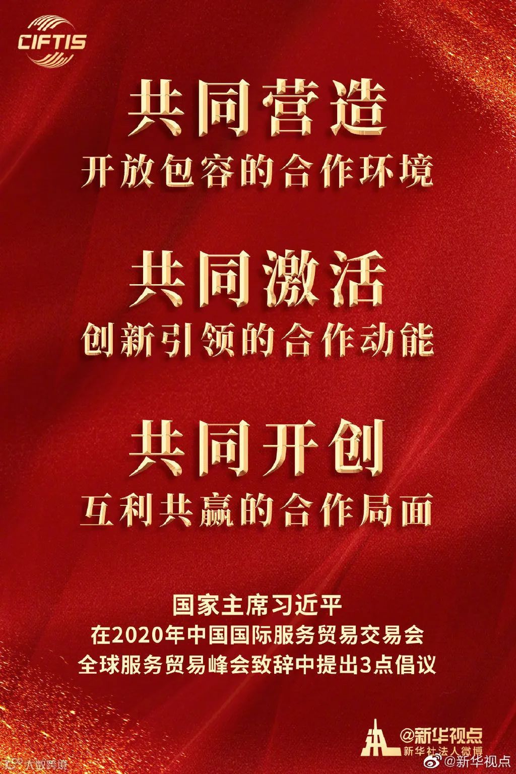 强调各国要共同营造开放包容的合作环境、共同激活创新引领的合作动能、共同开创互利共赢的合作局面,中国将坚定不移扩大对外开放,继续放宽服务业市场准入,发展服务贸易新业态新模式,支持组建全球服务贸易联盟,支持北京打造国家服务业扩大开放综合示范区,带动形成更高层次改革开放新格局