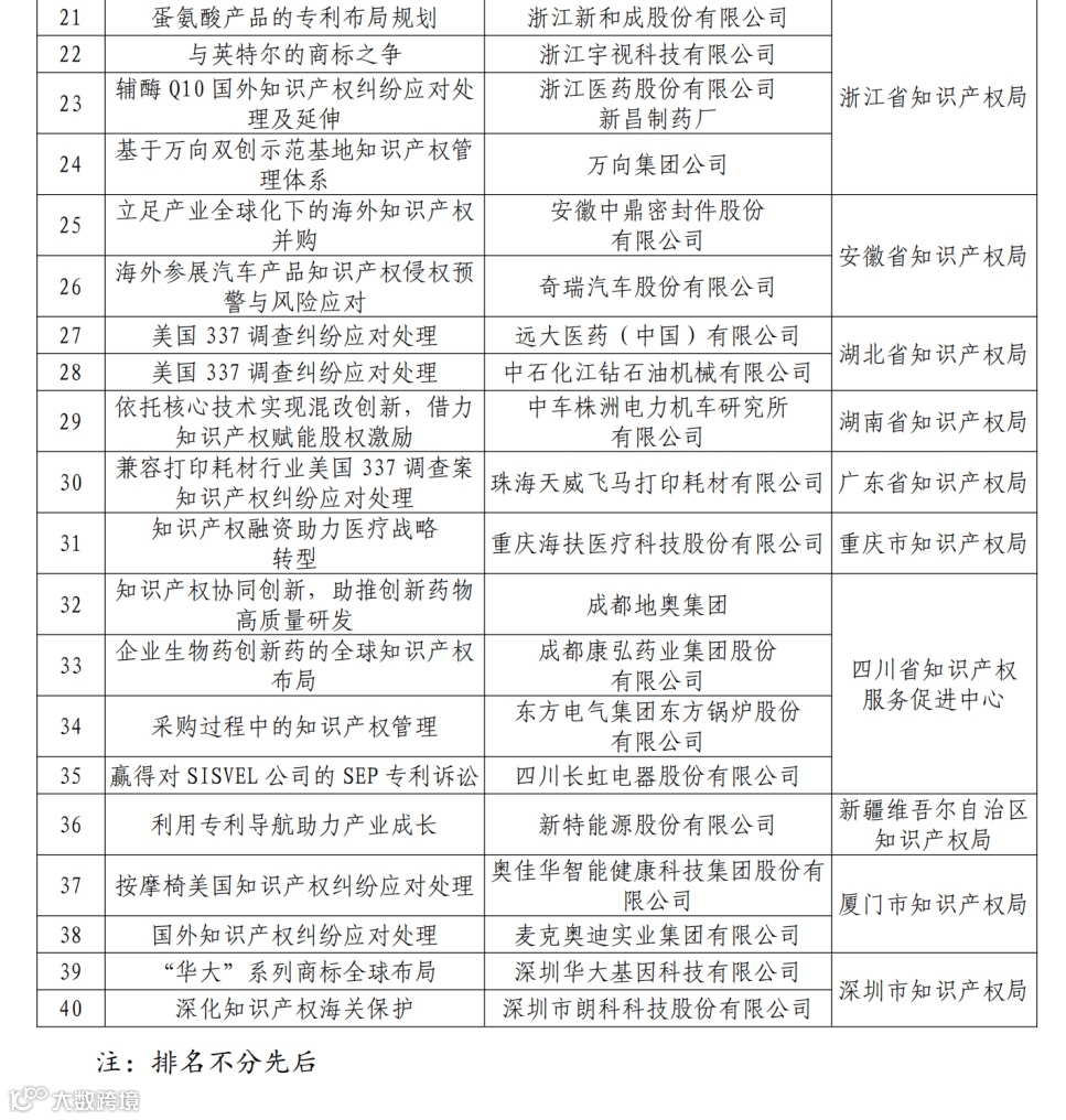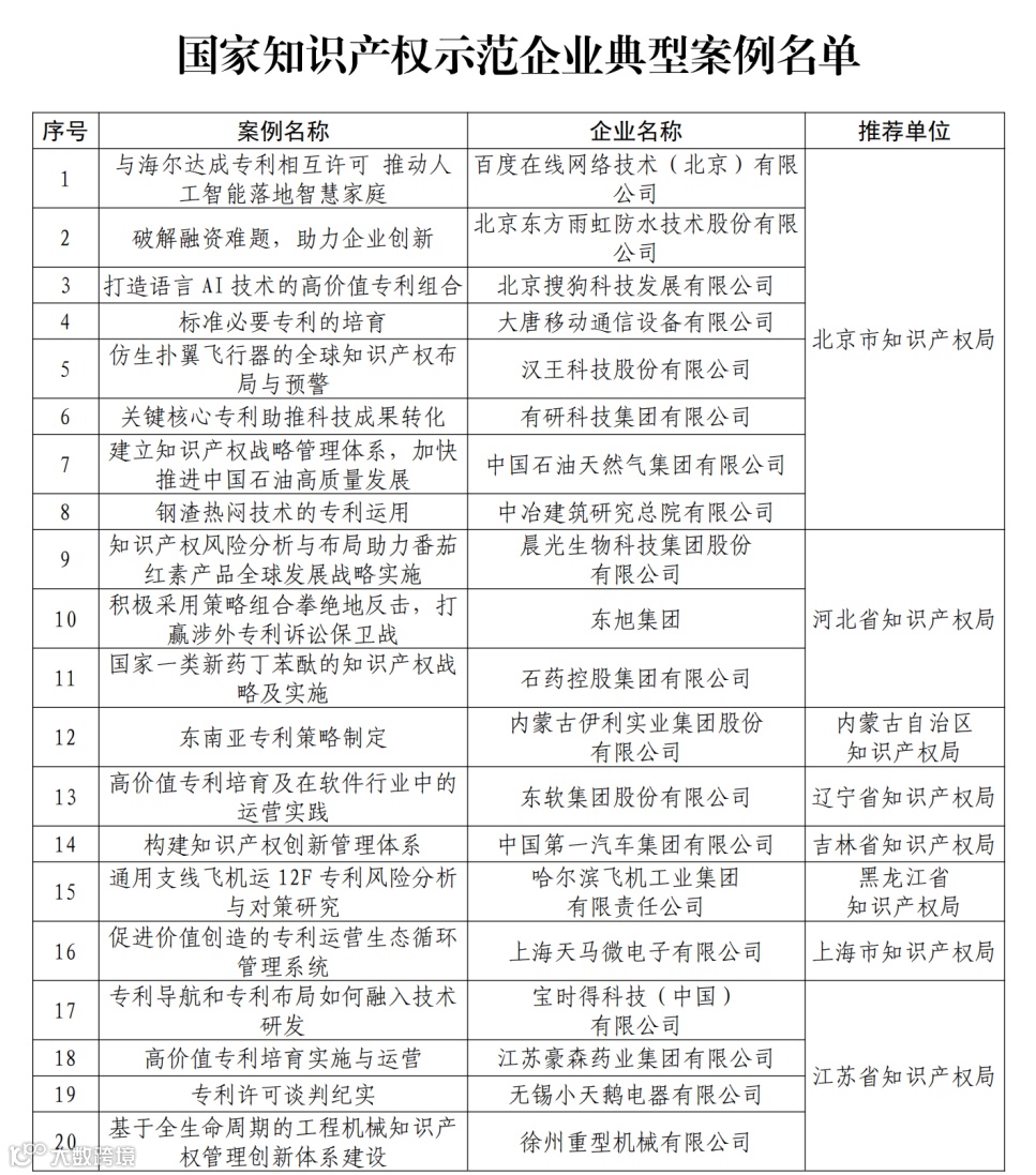 为充分发挥国家知识产权优势示范企业引领带动作用,探索运用知识产权提升企业核心竞争力、支撑产业高质量发展的有效路径,按照《国家知识产权局办公室关于国家知识产权示范企业和优势企业典型案例征集遴选和年度考核工作的通知》(国知办函运字〔2020〕895号),经企业申报、地方局推荐、专家评审等环节,确定40个案例为国家知识产权示范企业典型案例(名单见附件)。案例详情将陆续在国家知识产权局政府网站和中国知识产权报“强企业,树典型——示范企业知识产权典型案例”专栏公布。