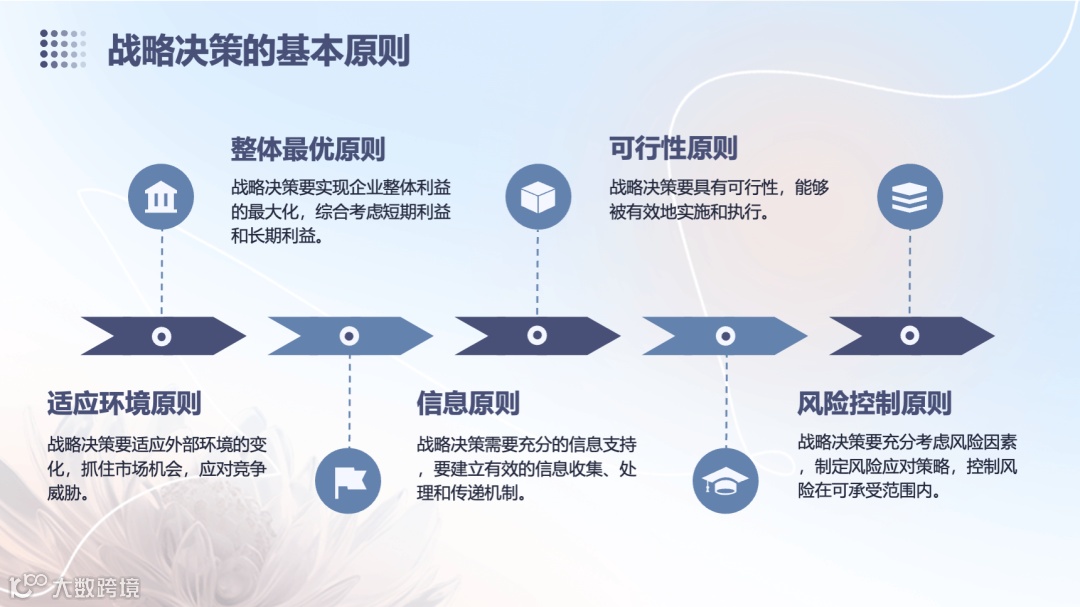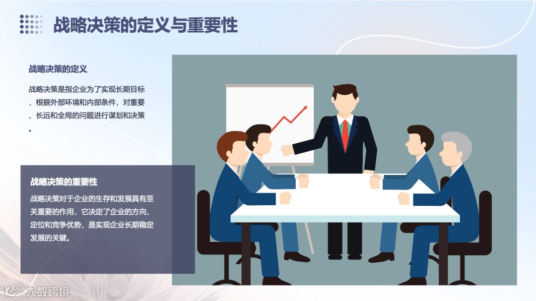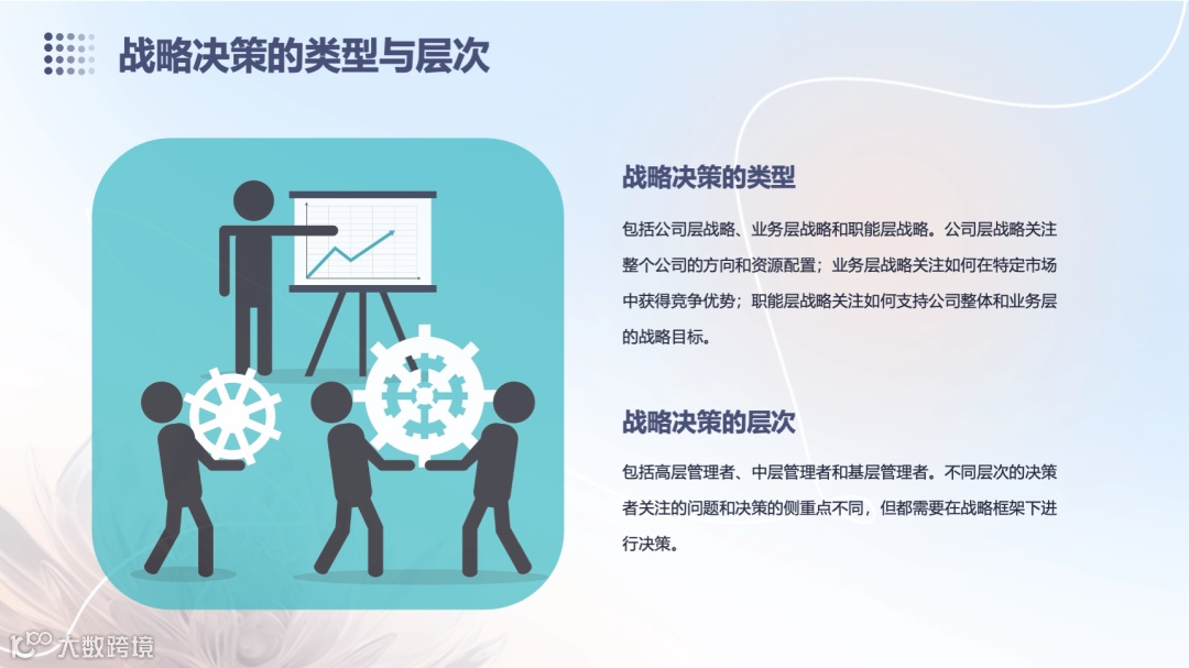 决策对象:涉及资源配置(如资金、人才、技术)、竞争定位(如高端vs.大众市场)、业务组合(如多元化vs.专业化)等重大议题。
